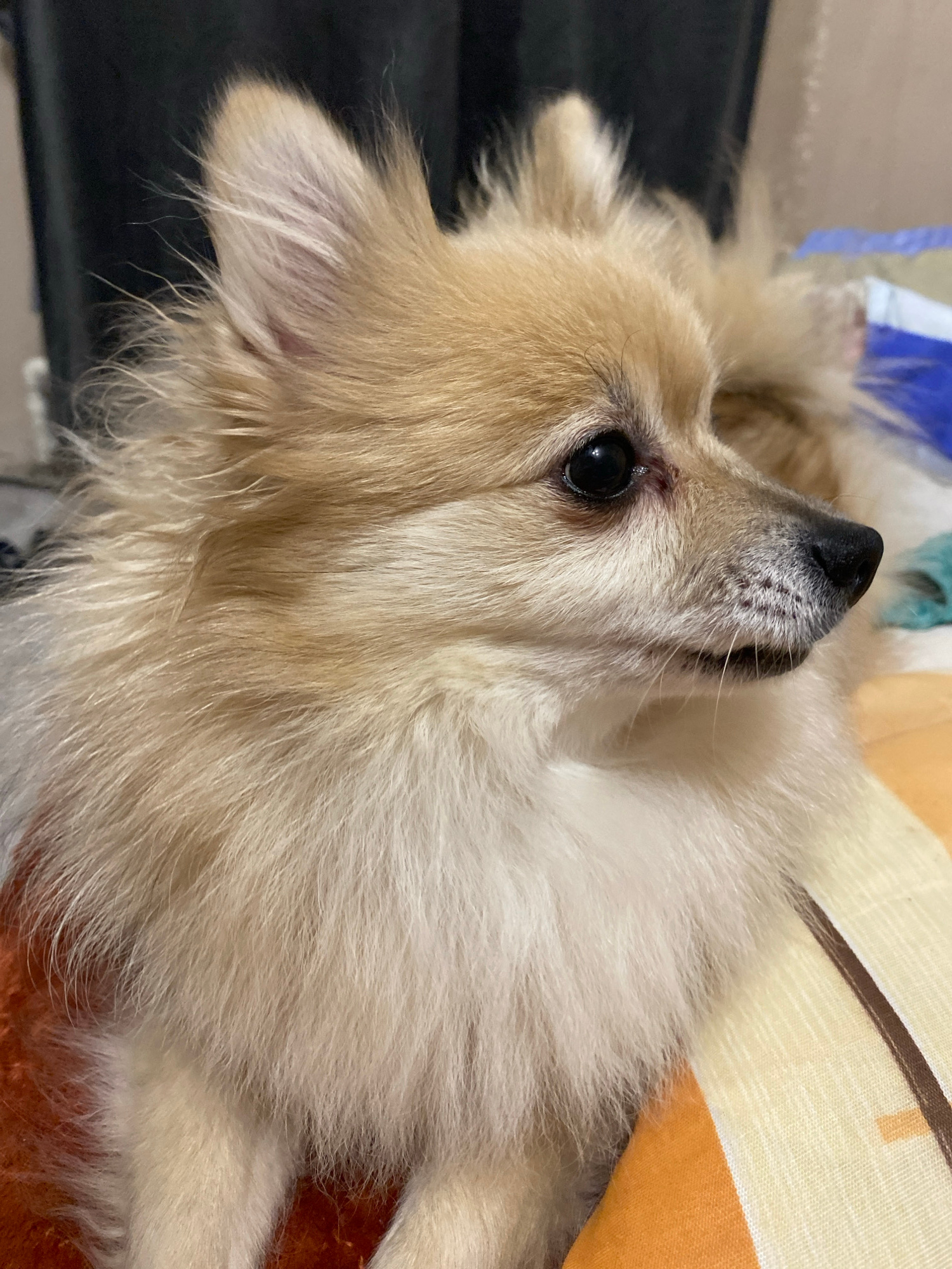 A close-up, upward-angled shot depicts a light-beige Pomeranian-type dog resting its head on a patterned pillow with orange, yellow, and brown hues. The dog's fur appears long and fluffy, obscuring itβ¦read more