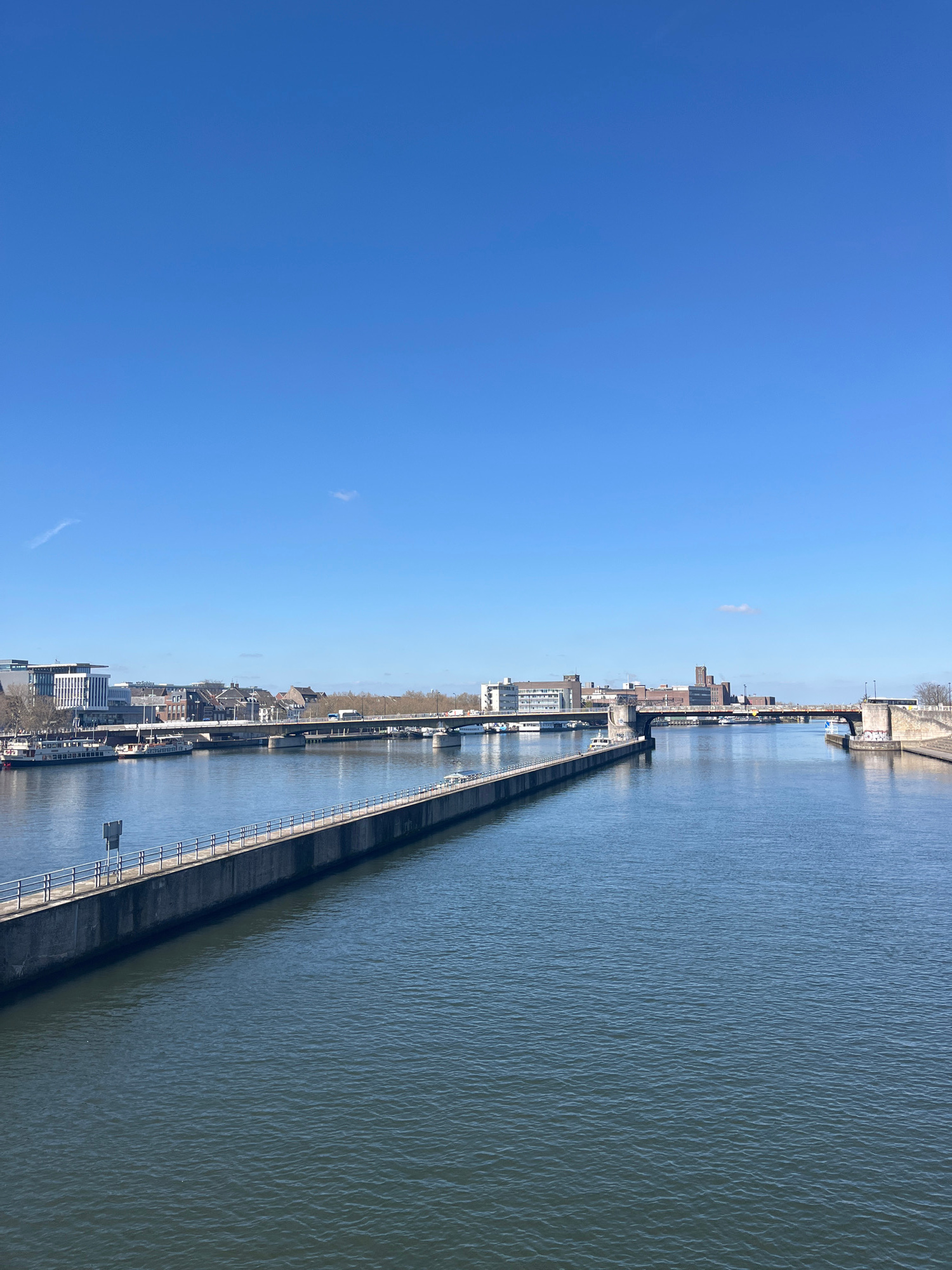 The image shows a view of the Maas River in Maastricht, Netherlands, featuring the Sint Servaasbrug (Saint Servatius Bridge) and the Stadspark Maastricht (Maastricht City Park) waterfront. The angle s…read more