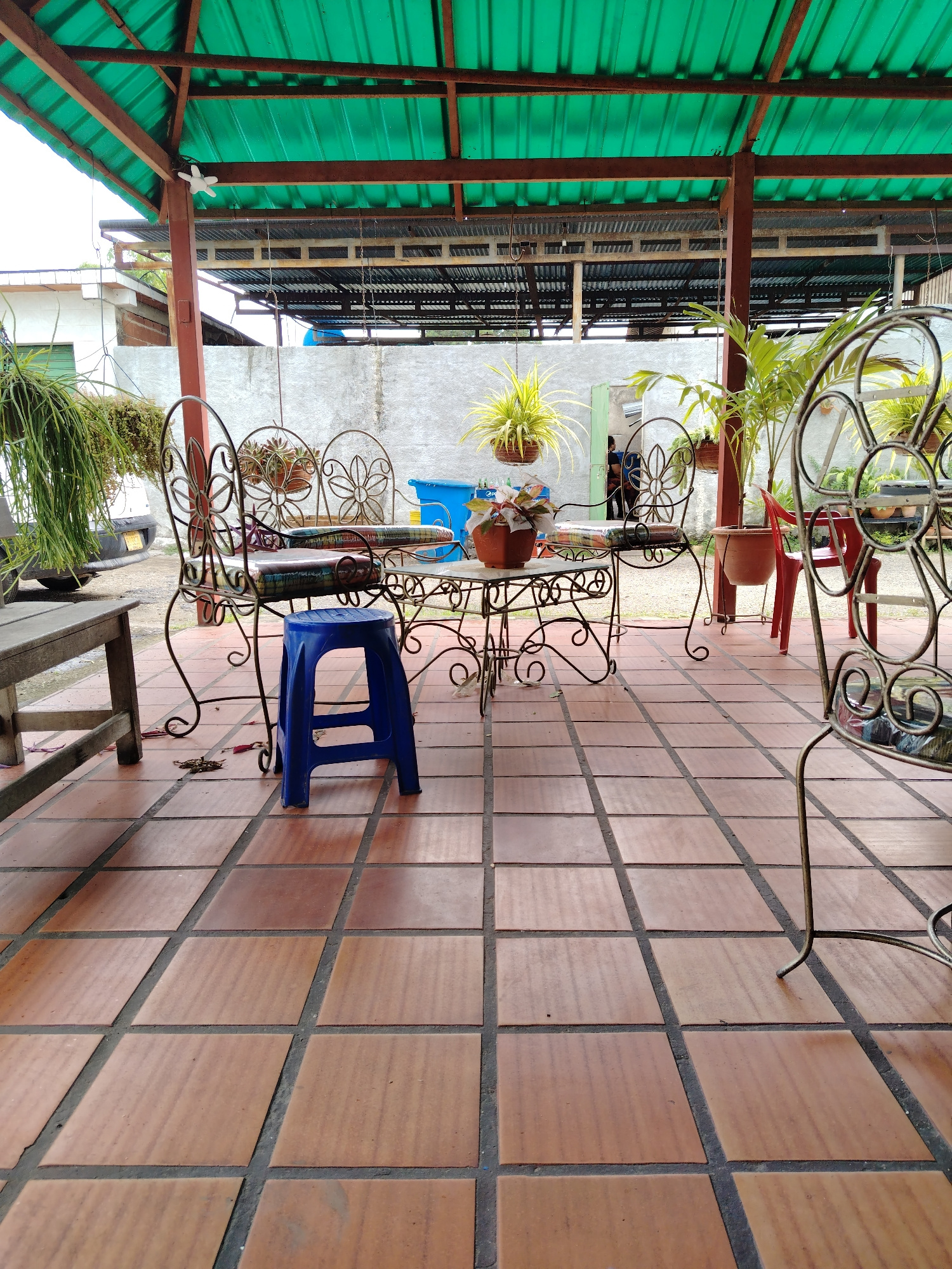 The image depicts an outdoor patio area in Tinaquillo, Venezuela, characterized by terracotta-colored tiled flooring and a green corrugated metal roof supported by brown beams. The patio furniture conβ¦read more