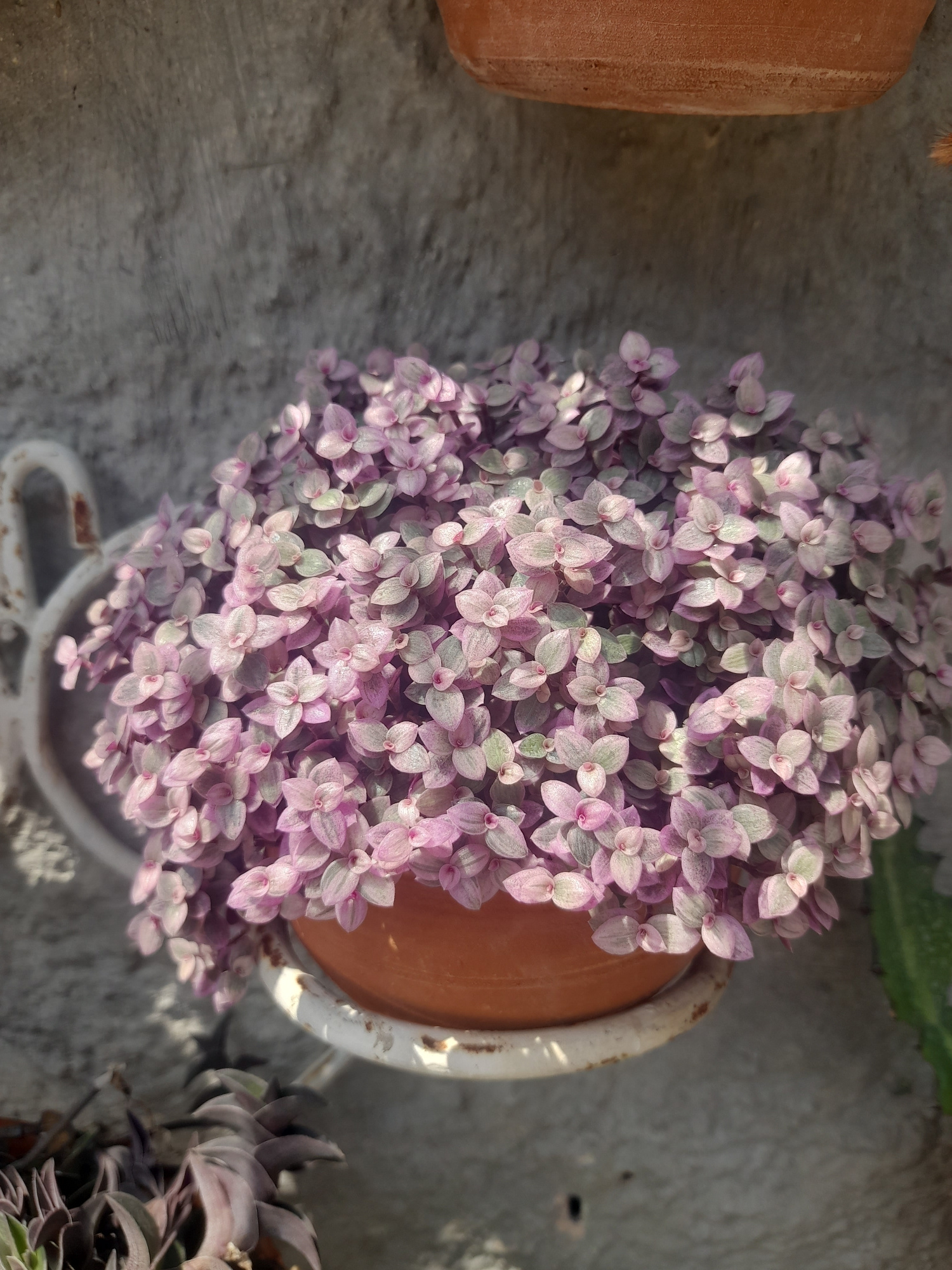 The image shows a plant in a pot. The plant has small, pink and green leaves. The pot is brown and white, and it appears to be old and slightly rusted. The plant is located on a grey surface, which co…read more