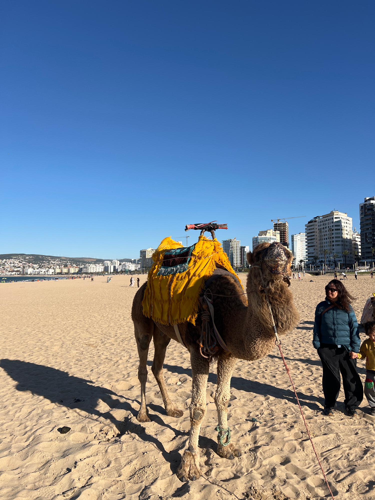 A medium, eye-level shot portrays a camel wearing a yellow saddle blanket and head covering on a sandy beach, likely the Tanger beach in طنجة, Morocco, given the city skyline in the background. The ca…read more