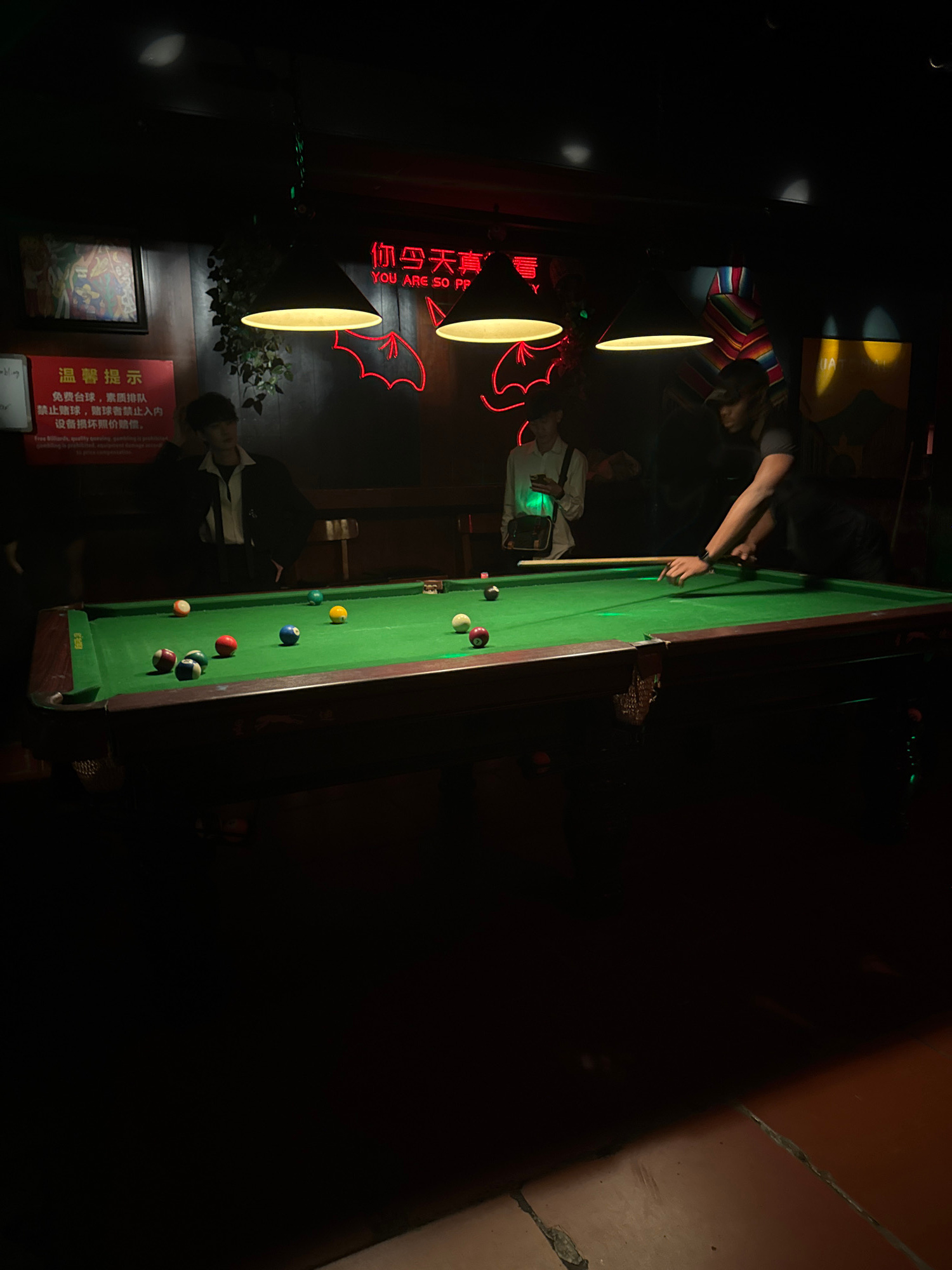 The scene depicts a dimly lit interior of a billiards establishment in Liangjiang, China. A green felt pool table occupies the midground, illuminated by three conical overhead lamps. Approximately 14…read more