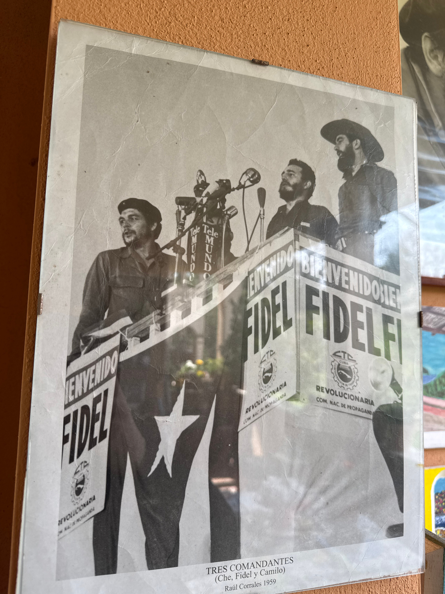 The image shows a black and white photograph, likely displayed in a frame. The photograph depicts three bearded men, identified in the text on the right as Che, Fidel, and Camilo, likely taken in 1959…read more