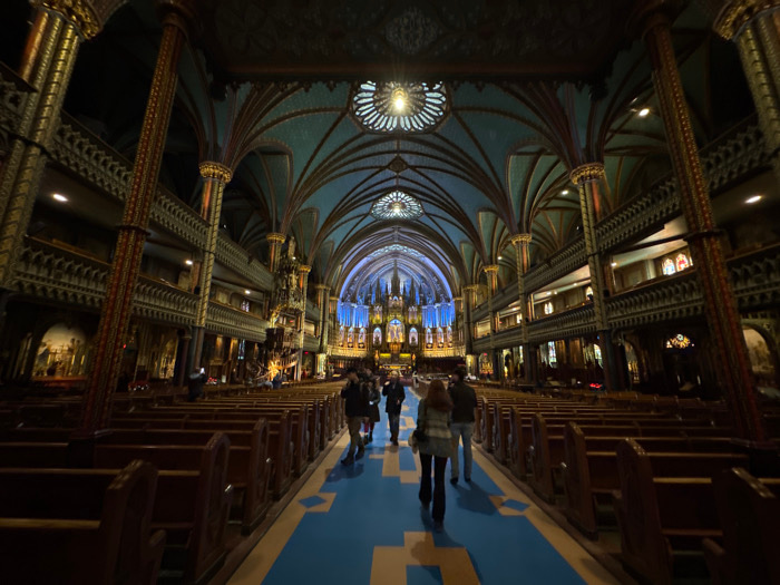 The interior of a grand cathedral is depicted. Rows of wooden pews line a blue central aisle, leading towards a brightly illuminated altar in the distance. Ornate columns and archways, richly detailed with carvings and gold accents, support a high, vaulted ceiling painted in shades of blue. Several people are seen walking along the aisle, adding a sense of scale to the vastness of the space. The overall atmosphere is one of reverence and architectural splendor. | Open Wire
