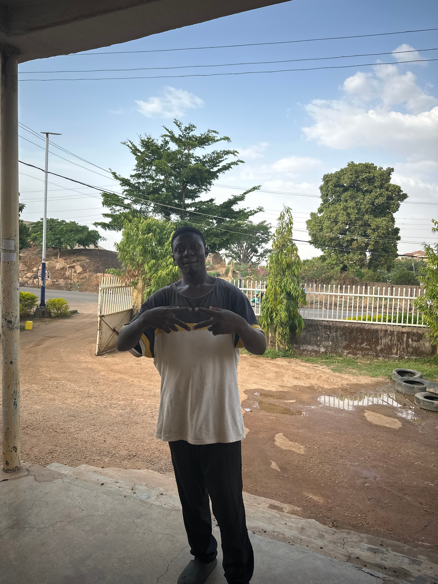 A young man stands on the edge of a concrete patio, framed by the vertical edges of a building structure. He faces the camera, his body turned slightly to the right, making a peace sign with both hand…read more