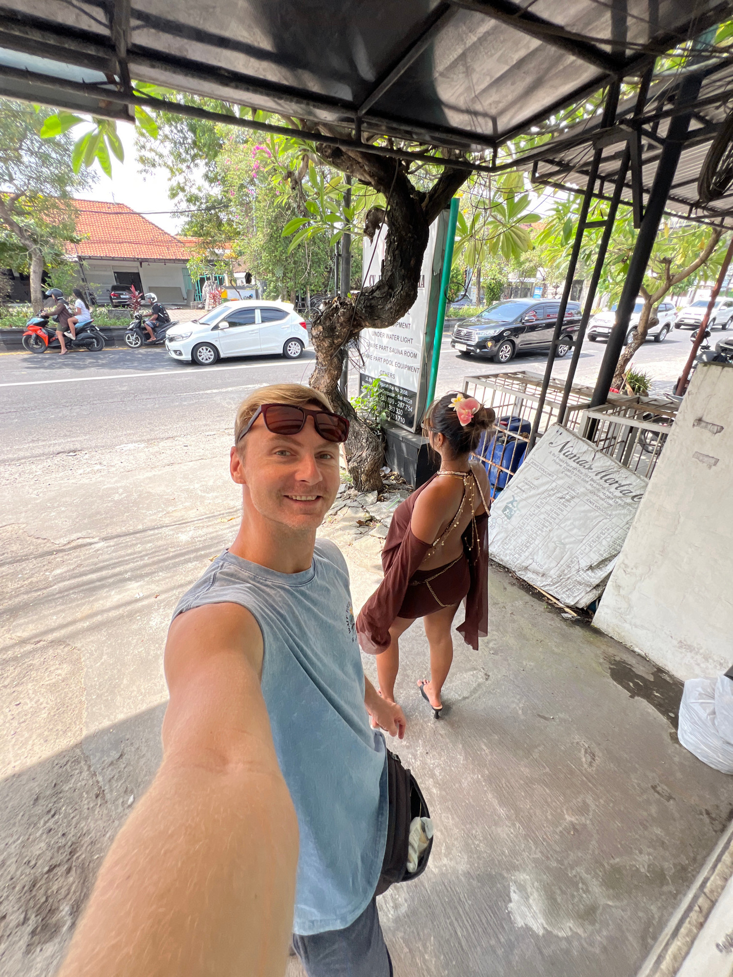 A man is taking a selfie in Denpasar, Indonesia. He is wearing a blue t-shirt and has sunglasses on his head. A woman with a flower in her hair is standing behind him. There is a street with cars and…read more