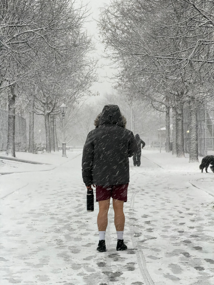 A person wearing shorts, socks, and shoes walks in the snow, wearing a winter jacket. The sidewalk and surrounding area are covered in snow. Trees line the sidewalk. Snow is falling heavily. The perso…read more