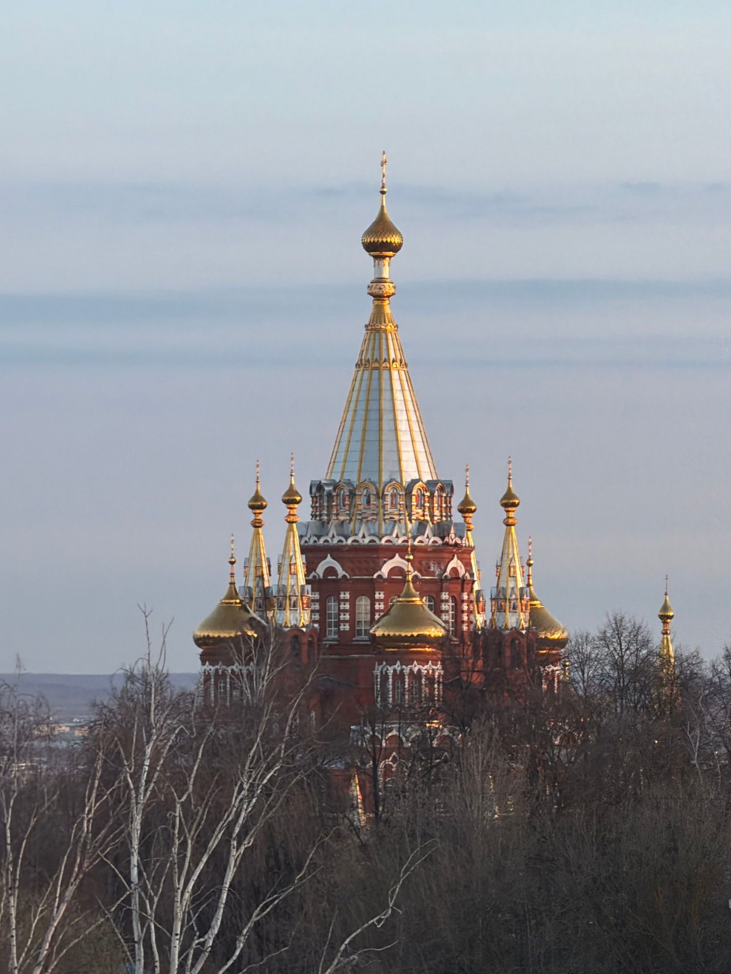 The image shows the Orthodox St. Michael's Cathedral in Izhevsk, Russia. The cathedral, with its red brick walls, white trim, and gold domes, is partially obscured by bare trees on the right. The sky…read more