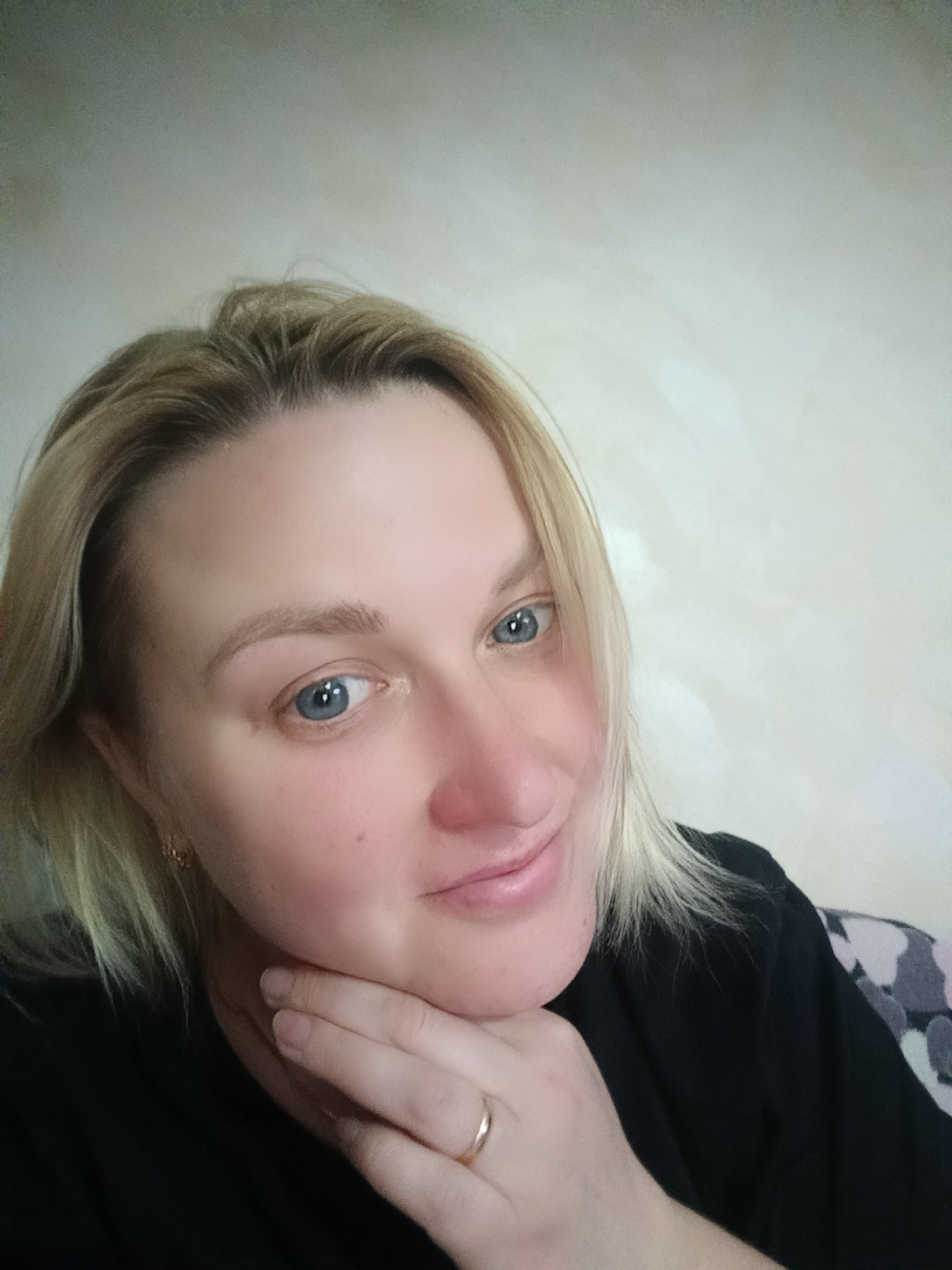 A blonde woman, likely located in Chaikovsky, Russia, is depicted in a head-and-shoulders portrait, presumably a selfie, taken indoors during daytime. She has fair skin, striking blue eyes, and natura…read more