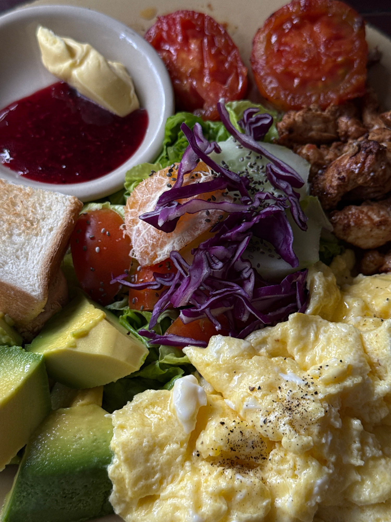 A close-up, overhead shot reveals a plate of food, potentially breakfast, in North Kuta, Indonesia. The plate features scrambled eggs seasoned with pepper, sliced avocado, grilled tomatoes, pieces of…read more