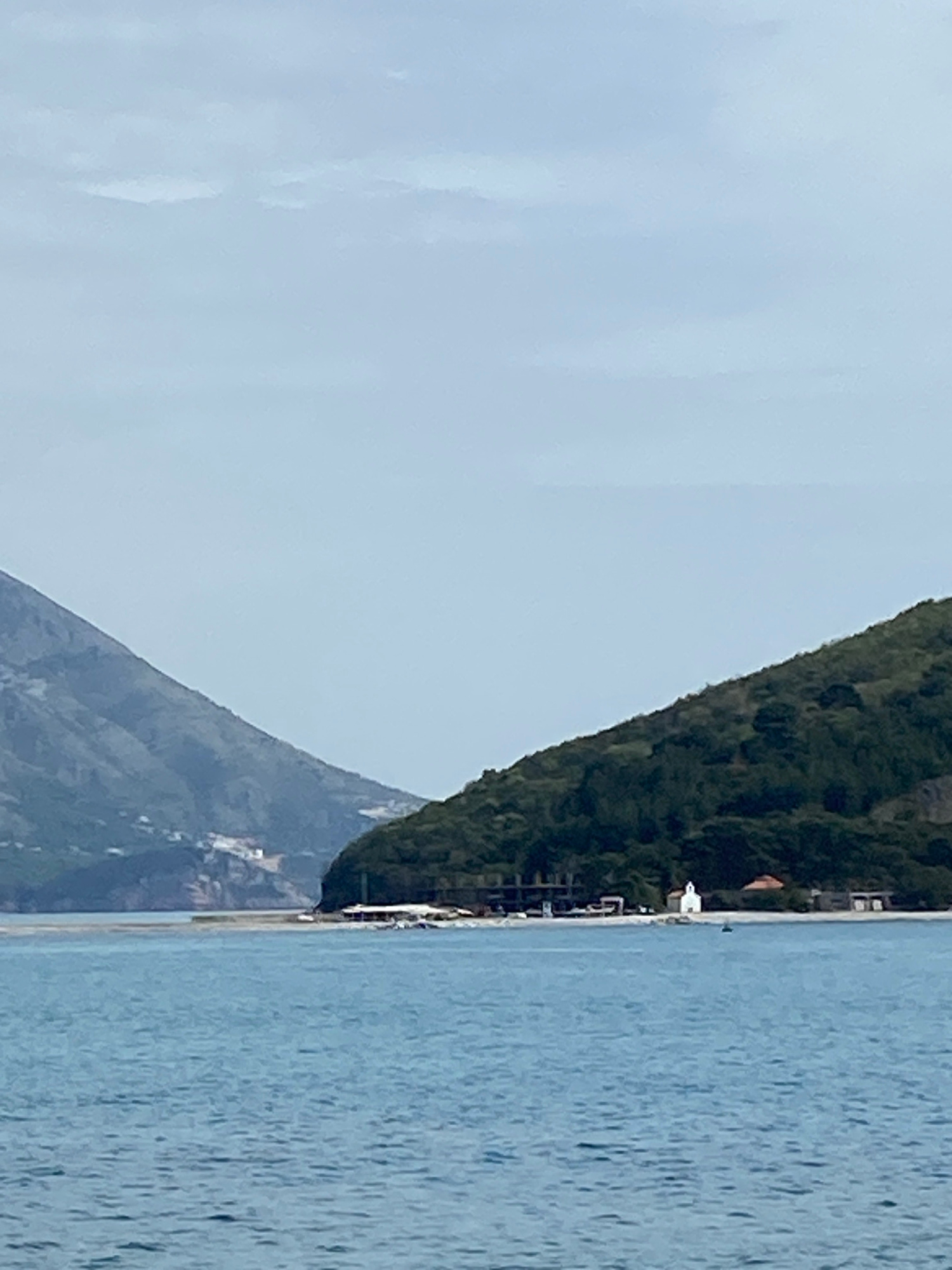 The image, when properly oriented, presents a serene coastal landscape. On the left, a light blue sky with subtle cloud formations occupies a large portion of the frame. The right side is dominated by…read more