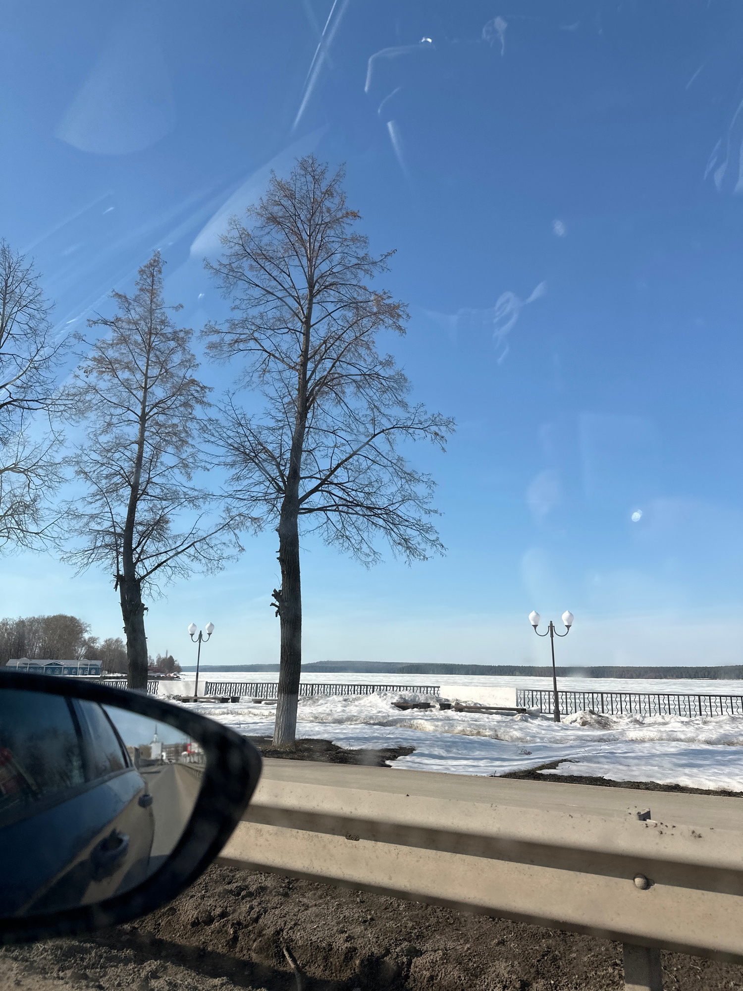 The image, taken from inside a car, shows a roadside view in Votkinsk, Russia. Through the windshield and side mirror, a clear blue sky is visible above bare trees. A light pole stands alongside a con…read more