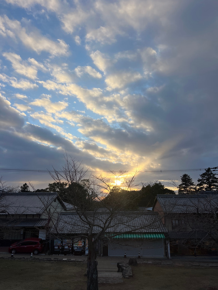 The image captures a sunset with striking light rays piercing through a sky filled with layered, textured clouds. The horizon features rooftops and trees, silhouetted against the bright sunlight. A ba…read more