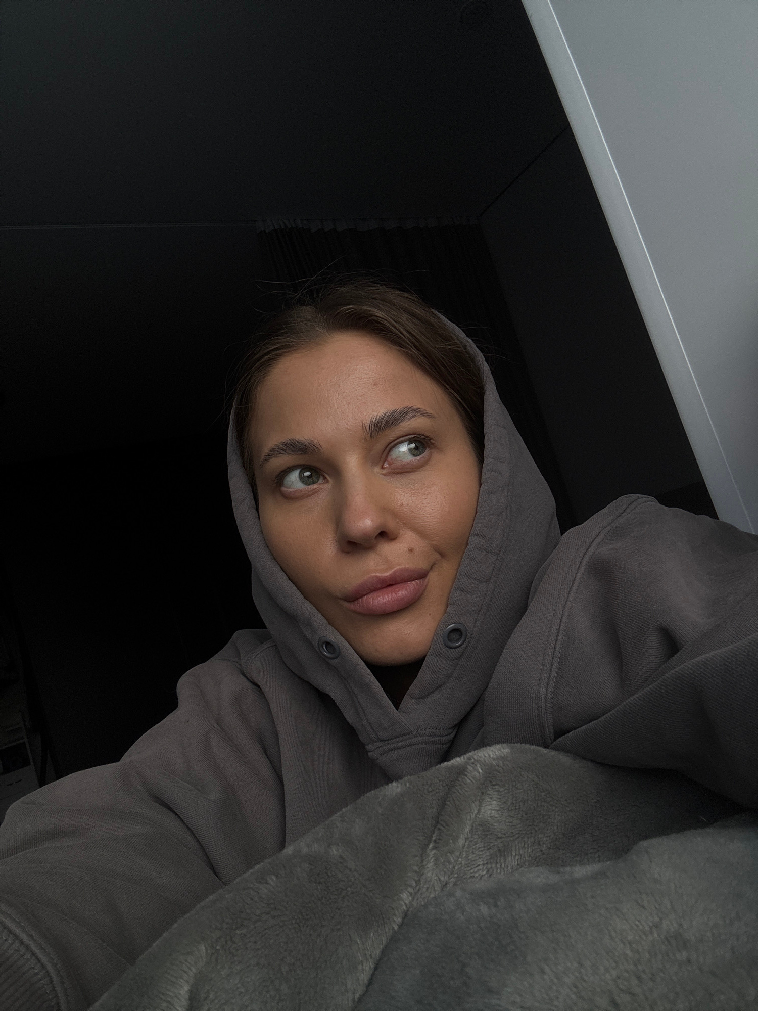 A woman wearing a grey hooded sweatshirt is looking upwards. She has light skin, light brown hair, and green eyes. The background consists of dark grey and white surfaces. The location is not discerni…read more