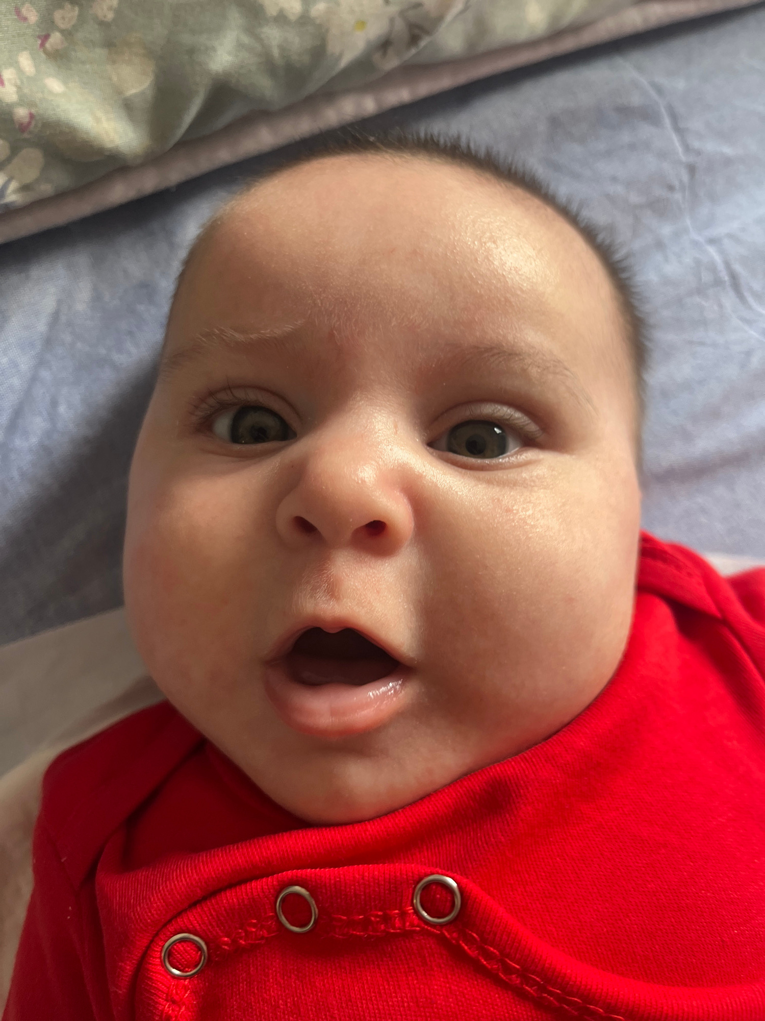 A close-up shot depicts a baby lying on a light blue and white patterned surface, wearing a red onesie with silver snaps visible. The baby's face is the primary focus, revealing light skin, a small no…read more