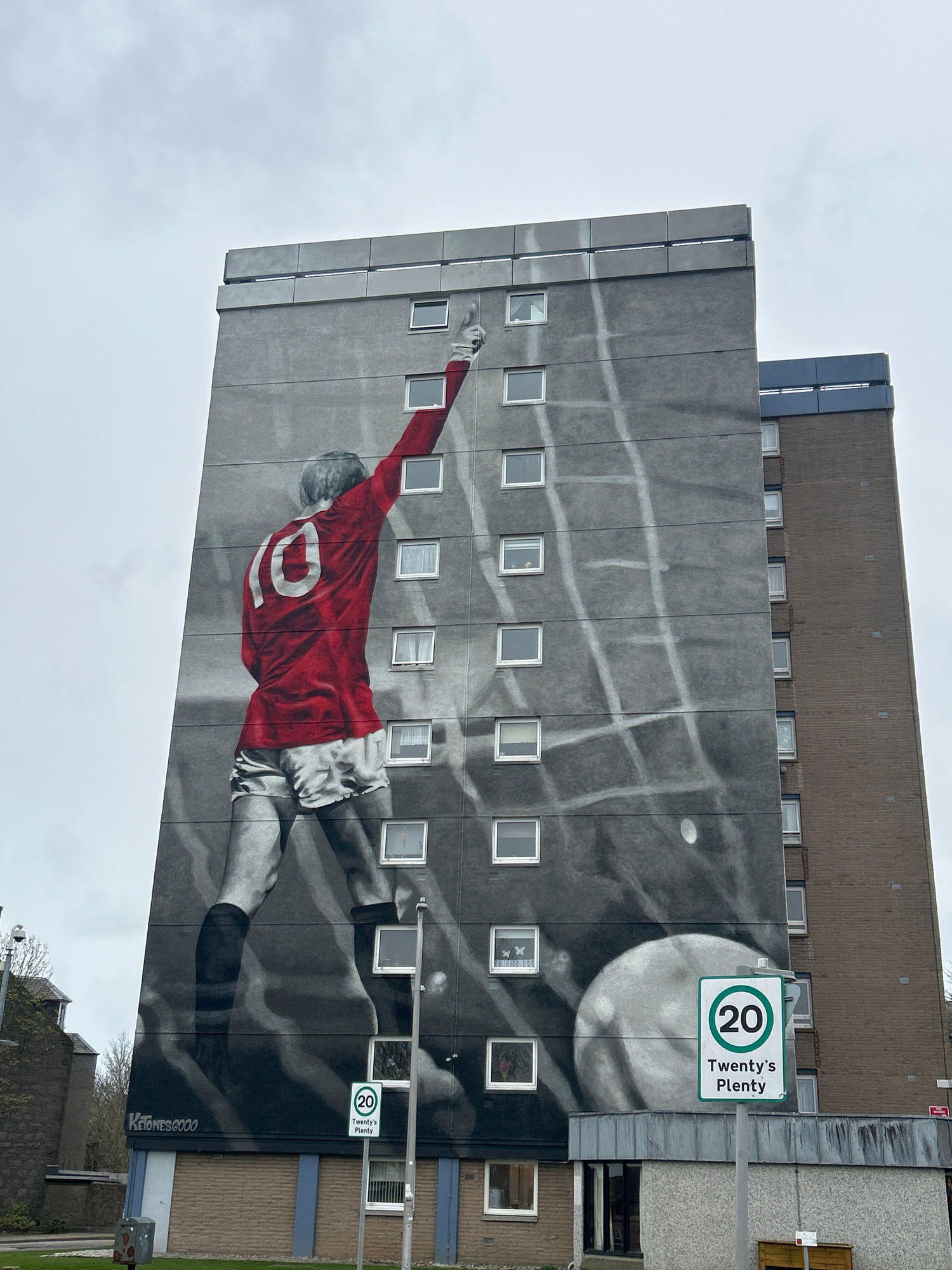 The image depicts a mural on the side of a building, likely in Aberdeen City, United Kingdom. The mural is a black and white image of a soccer player diving to head a ball, wearing a red jersey with t…read more