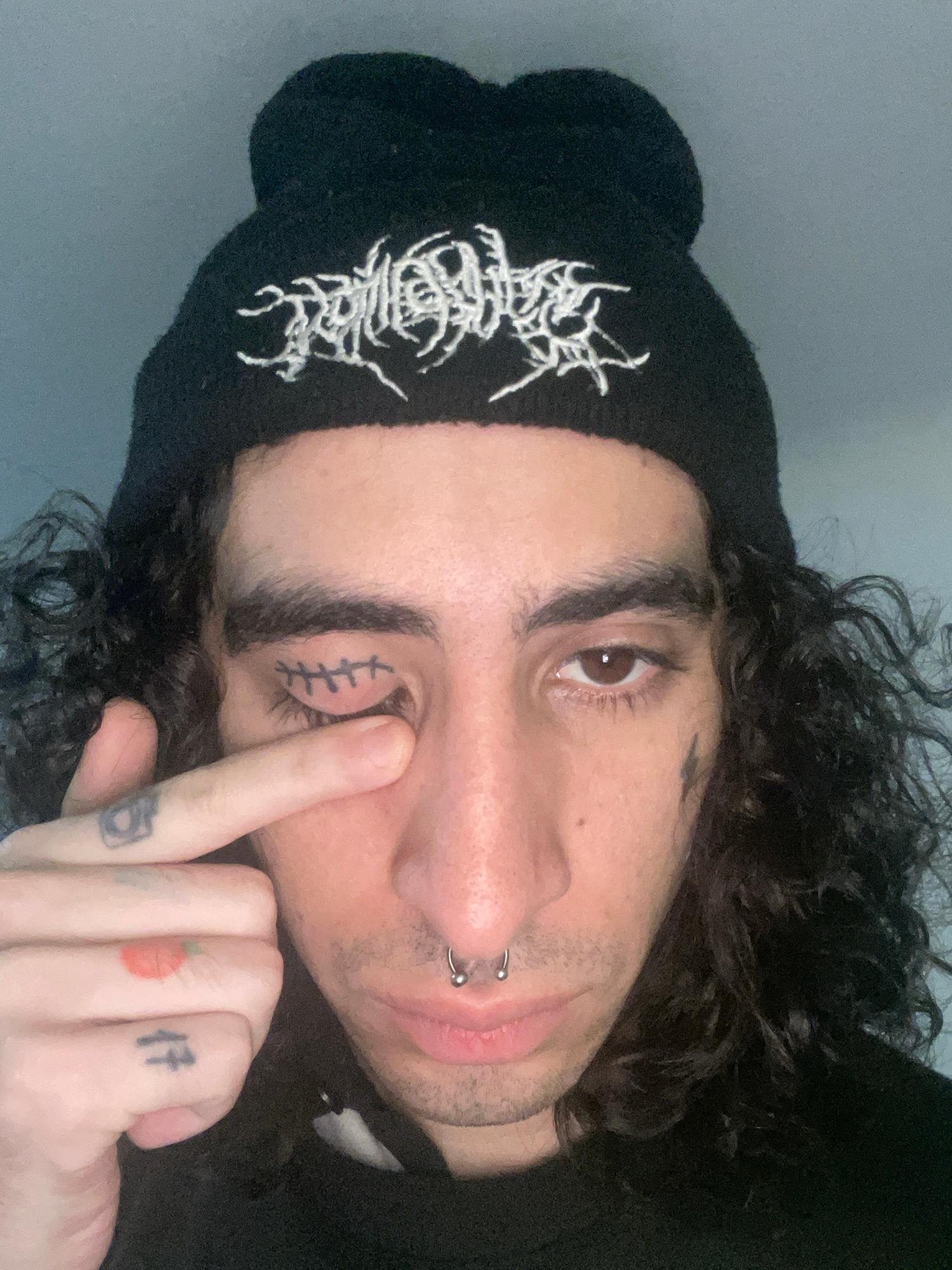 A close-up, angled shot depicts a person with dark, curly hair wearing a black beanie with a light-colored, illegible design. The person has a nose ring and tattoos on their fingers, including numbersβ¦read more