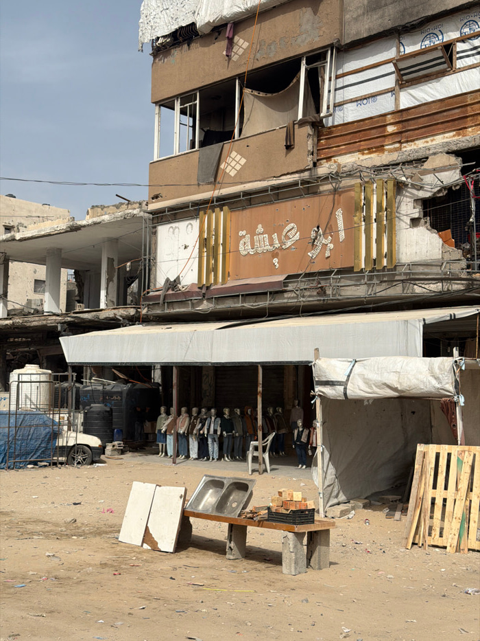 An exterior scene depicts a street in Gaza City, Palestinian Territory, characterized by significant structural damage. The central focus is a multi-story building displaying extensive wear and destru…read more