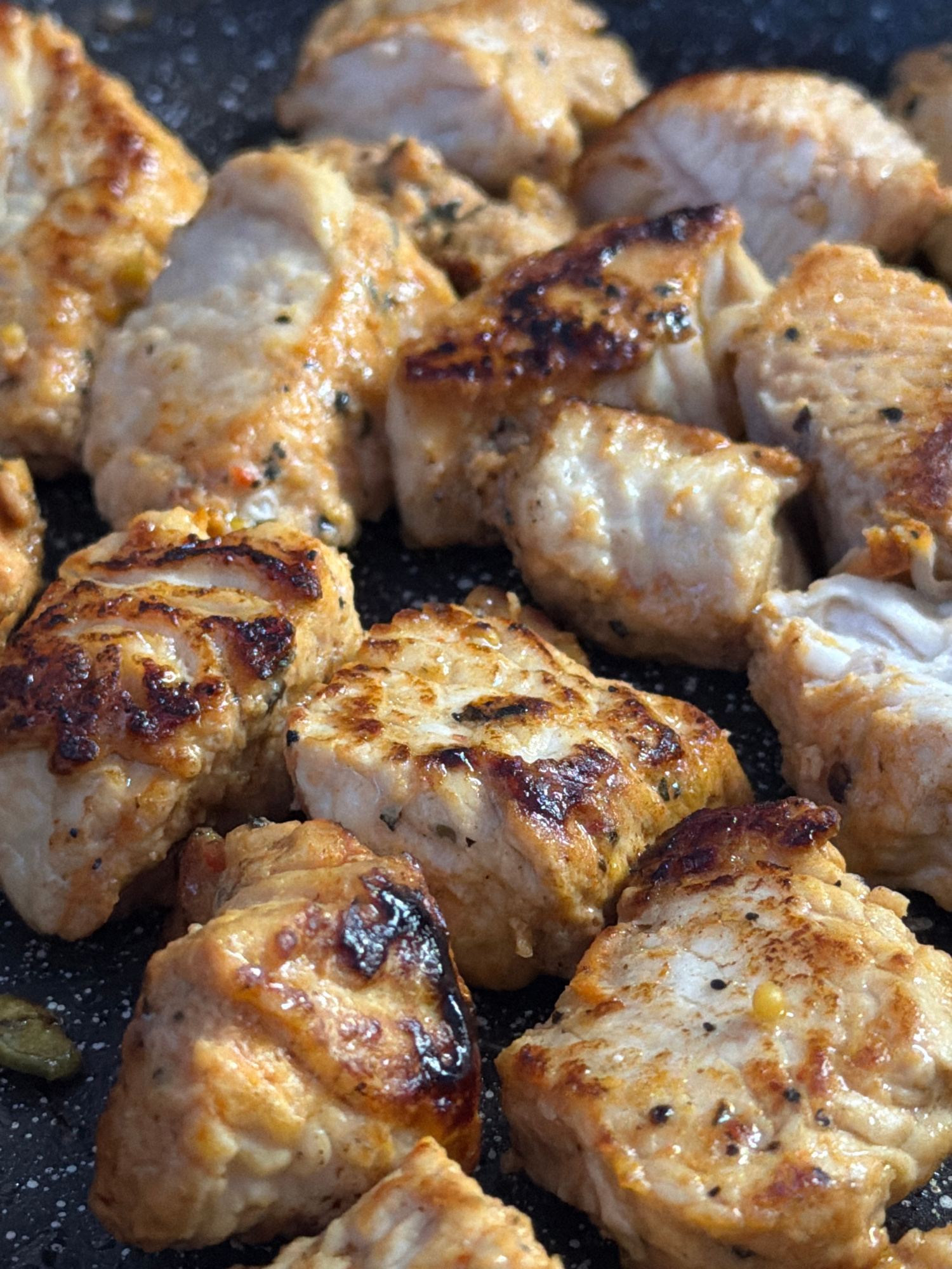 The image shows a close-up of cooked chicken pieces. The pieces are browned and appear to have been pan-fried or grilled. Some pieces show distinct grill marks. The chicken appears to be seasoned with…read more