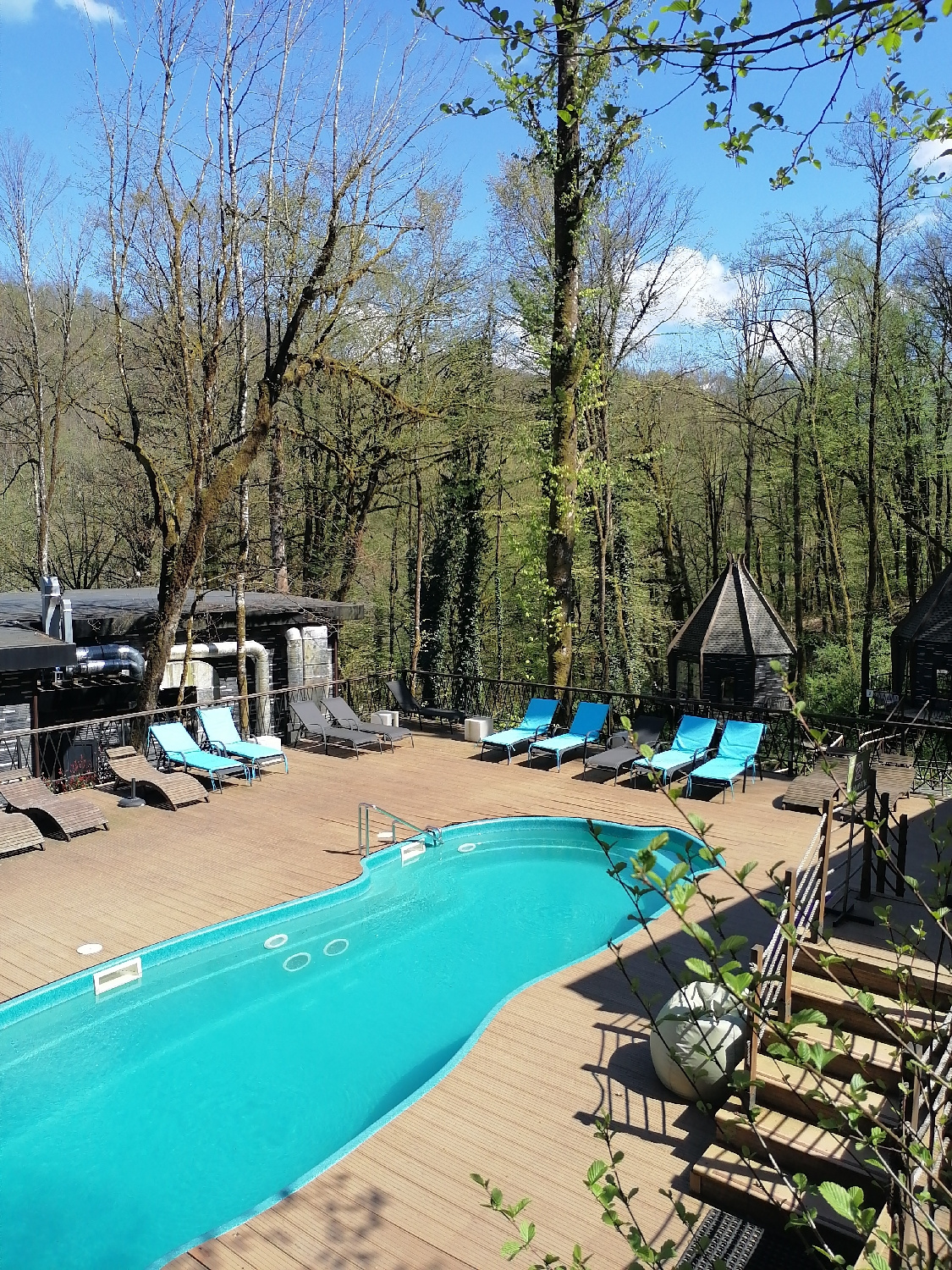 This image captures a serene outdoor swimming pool area nestled within a lush forest, likely in Medoveevka, Russia. The scene is dominated by a distinctly shaped, light blue swimming pool surrounded b…read more