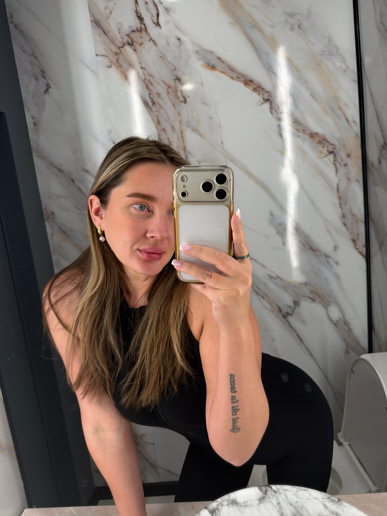 A woman with shoulder-length highlighted hair is taking a selfie in a bathroom. She is wearing a black top and black leggings. Her phone is a modern iPhone with a clear case. She is wearing a ring on…read more