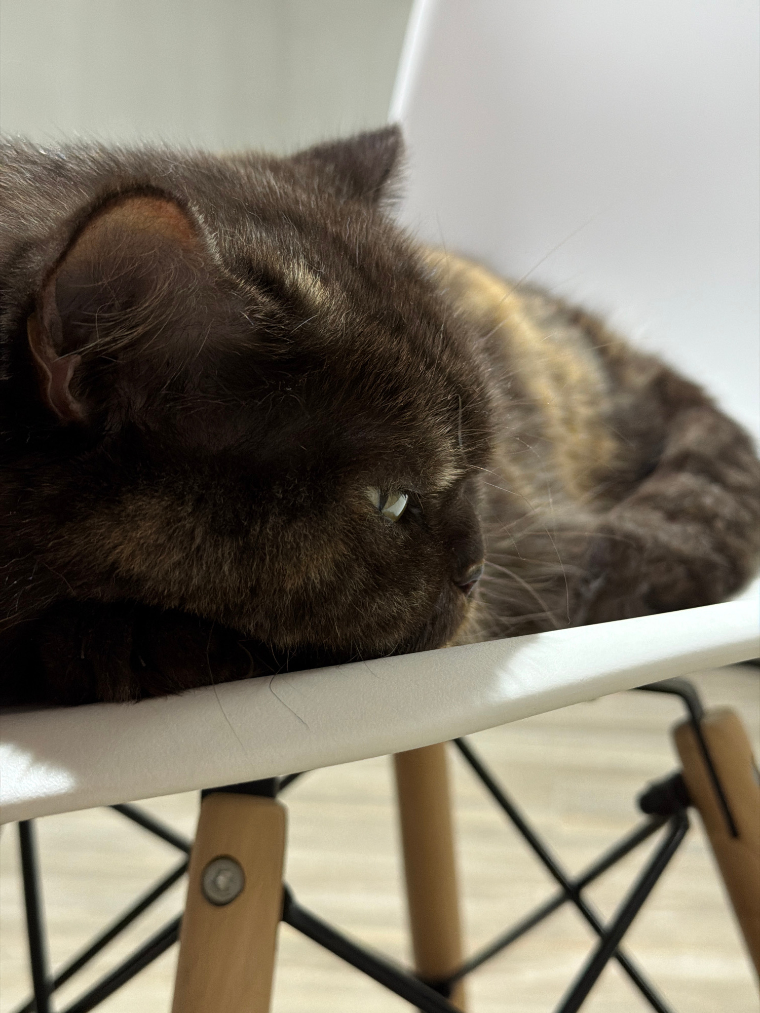 A close-up, upward-facing shot shows a dark tabby cat resting its head against a white chair leg with a black and wood frame. The cat's face is partially visible, showcasing its ear, fur pattern, and…read more