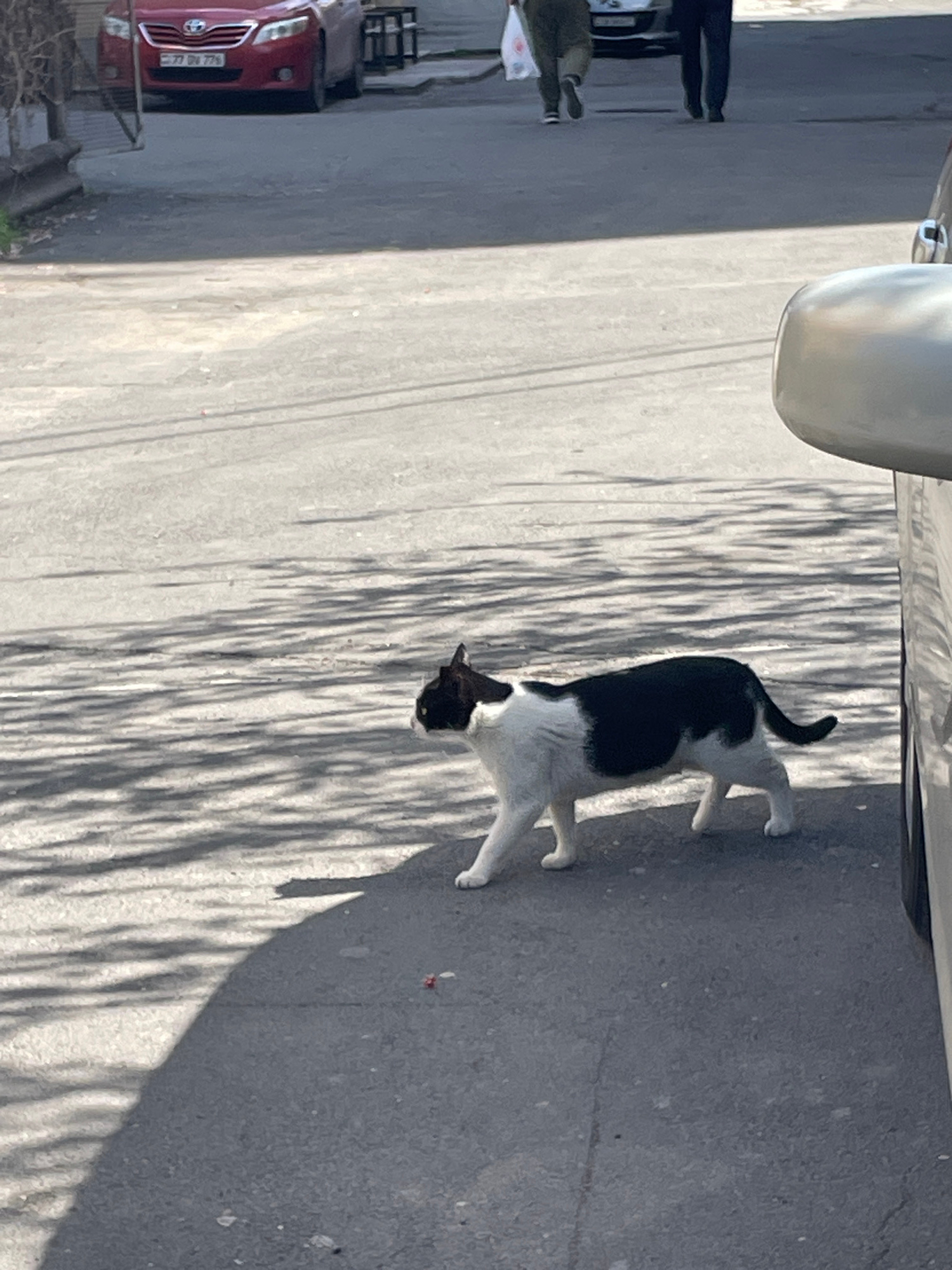 The image shows a black and white cat standing on a city street in Yerevan, Armenia. The street is paved and has tree shadows cast across it. A silver car is partially visible at the top of the frame,…read more