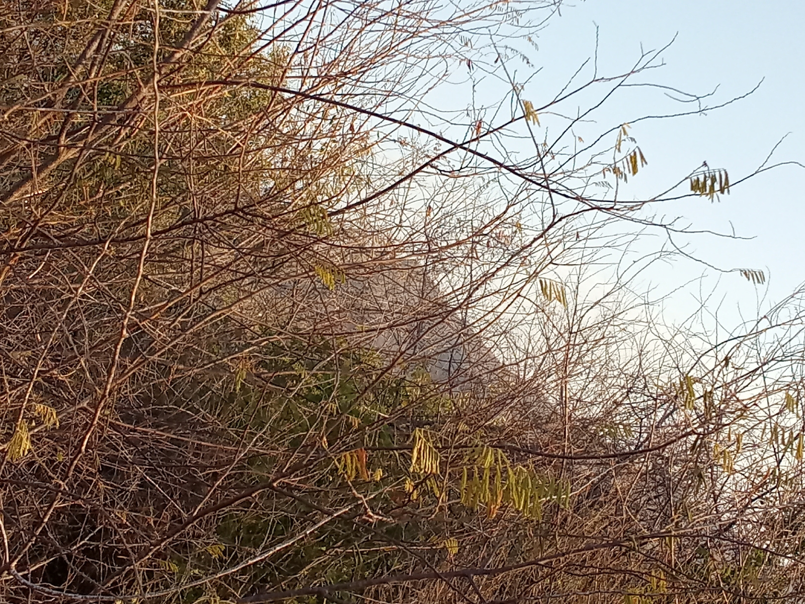The image shows a close-up of bare branches and some shrubs against a background that includes a hazy building or structure. The branches are thin and mostly brown, with a few scattered yellow-green c…read more