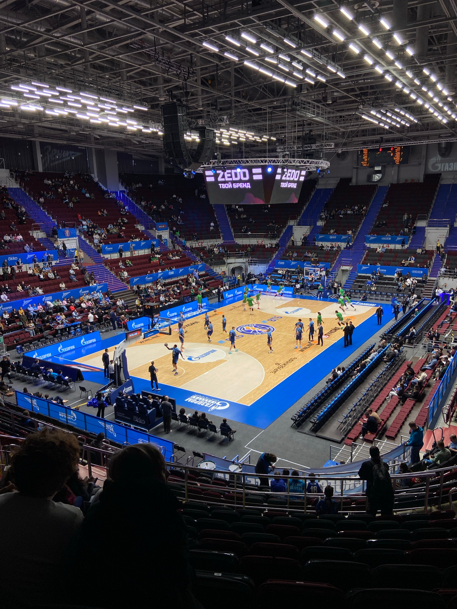 The image shows a basketball game at the Sibur Arena in Saint Petersburg, Russia. A game is in progress on the court, with players in blue and green uniforms. The arena is filled with spectators in t…read more