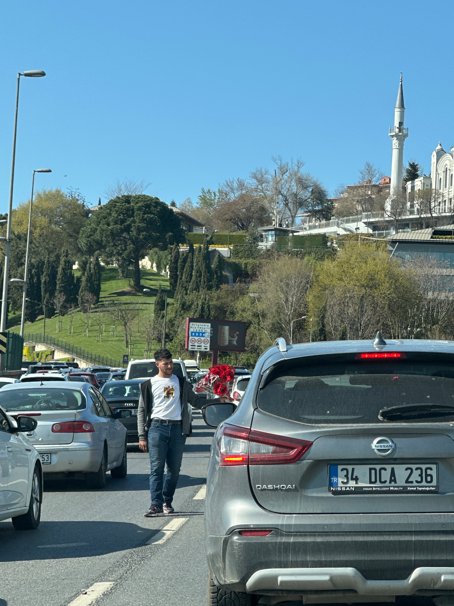 The image depicts a traffic scene in Üsküdar, Turkey. A man is standing between stopped cars, holding a bundle of red flowers, seemingly offering them for sale. He is wearing jeans, a white t-shirt, a…read more