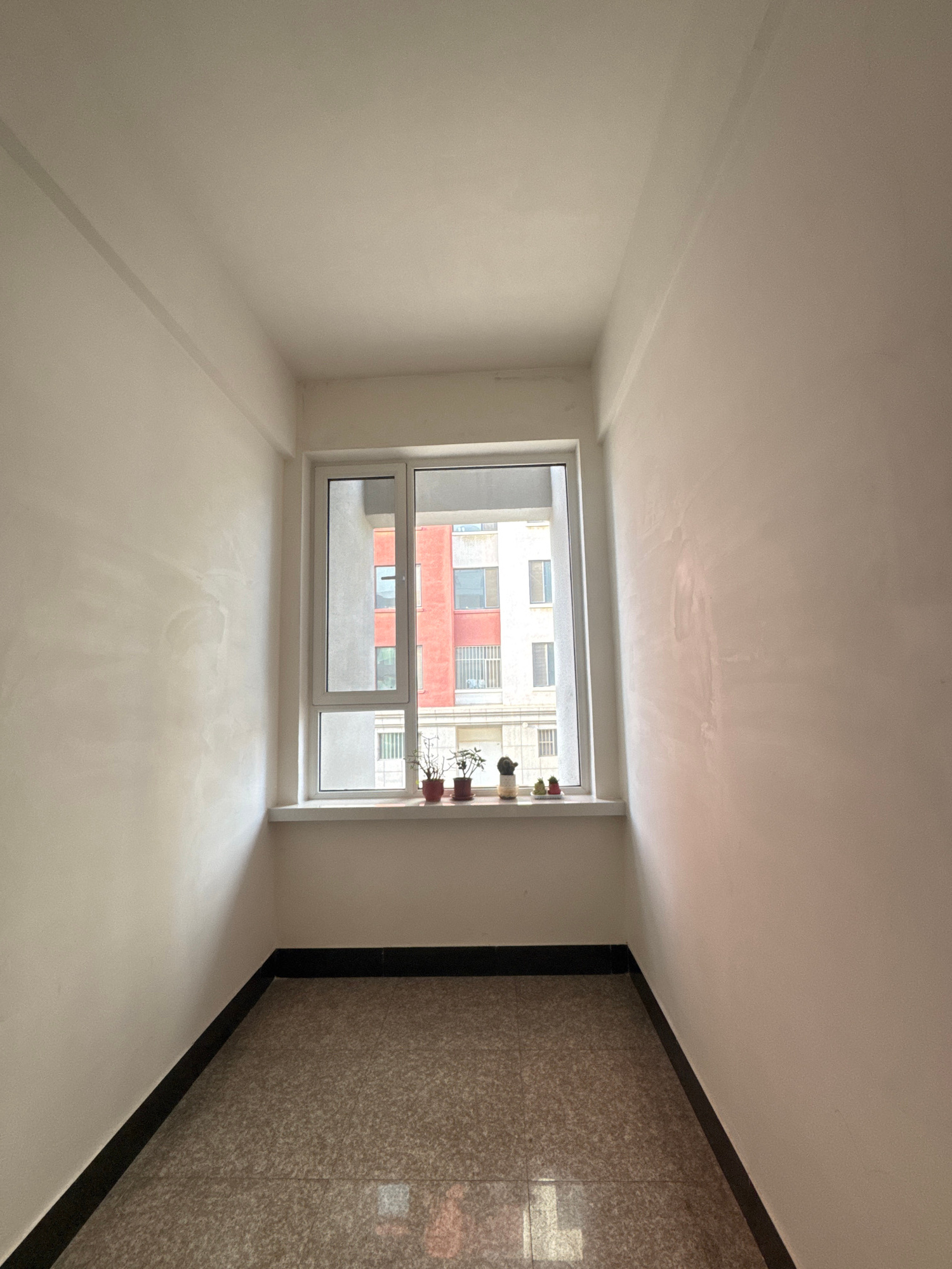 A sparsely furnished room in what is possibly an apartment located in Zhongtun, China, based on the building visible through the window. The room features white walls and ceiling, and a window with aβ¦read more