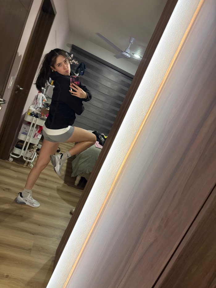 A young woman is lying on her side in a bedroom, appearing in a full-length mirror's reflection. She is wearing a black long-sleeved shirt and gray athletic shorts with white sneakers. Her hair is dar…read more