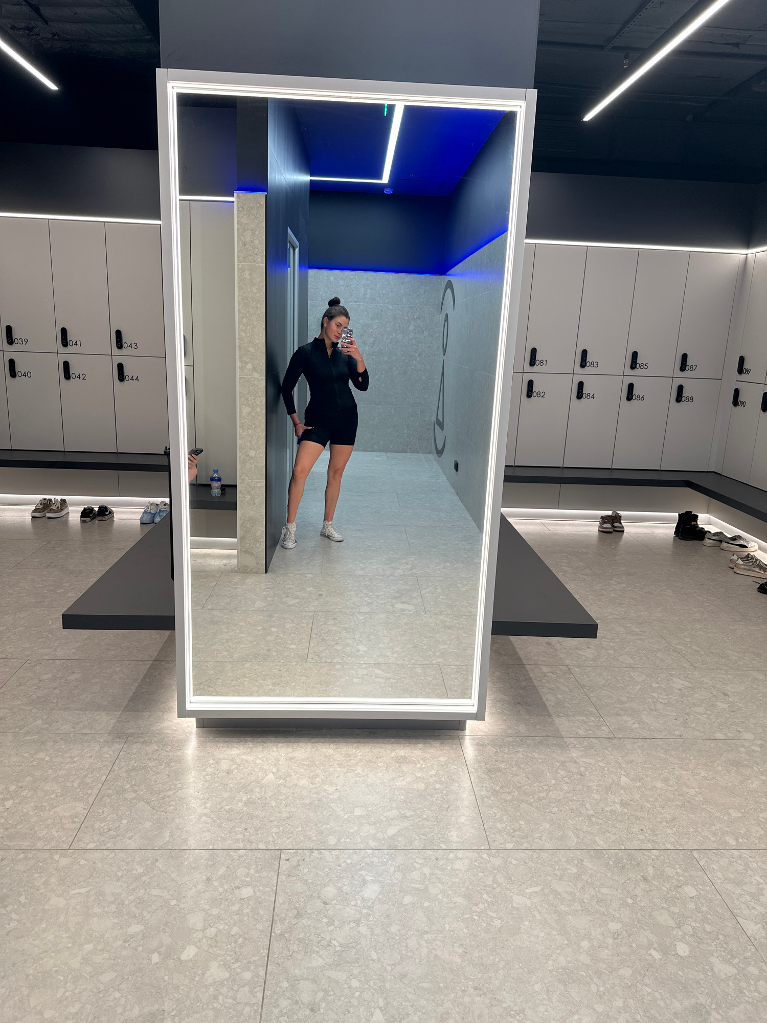A young woman is taking a mirror selfie in a modern gym locker room. She is wearing a black athletic outfit. The locker room features rows of white lockers with black numbering. The floor is tiled in…read more
