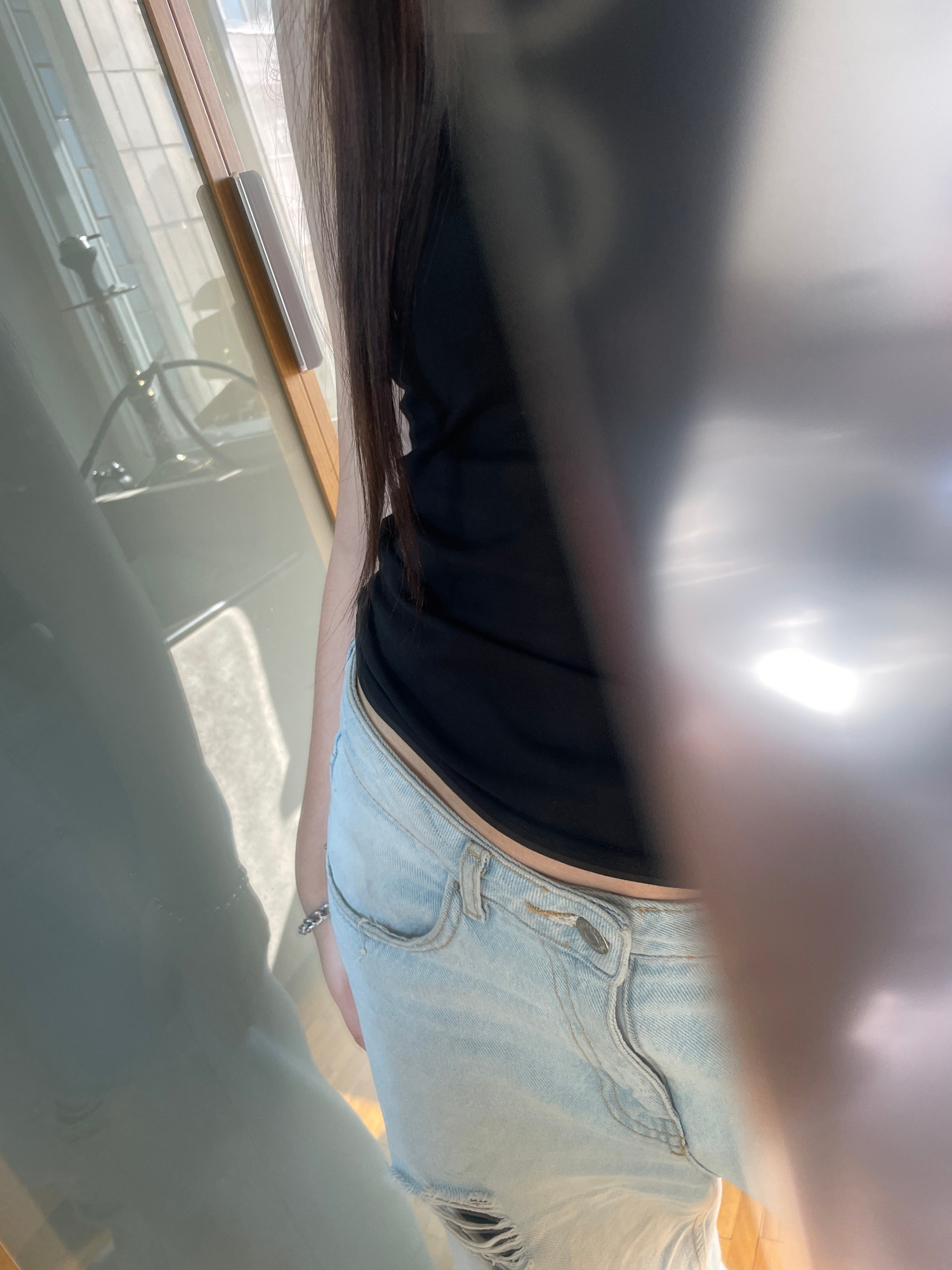 A person is seated indoors at a table. The individual is wearing a black top and light blue denim shorts. A silver bracelet is visible on their left wrist. To the left, there is a brown and silver obj…read more