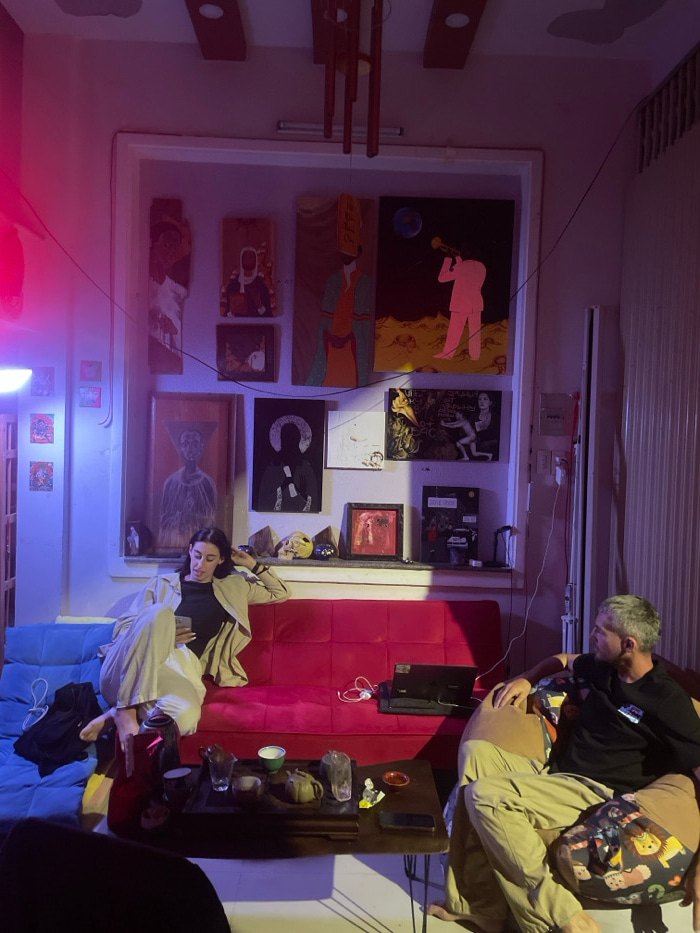 The scene depicts an interior space in Nha Trang, Vietnam, illuminated by a combination of blue and red ambient lighting. Two individuals are present, seated on upholstered sofas. On the left, a femal…read more