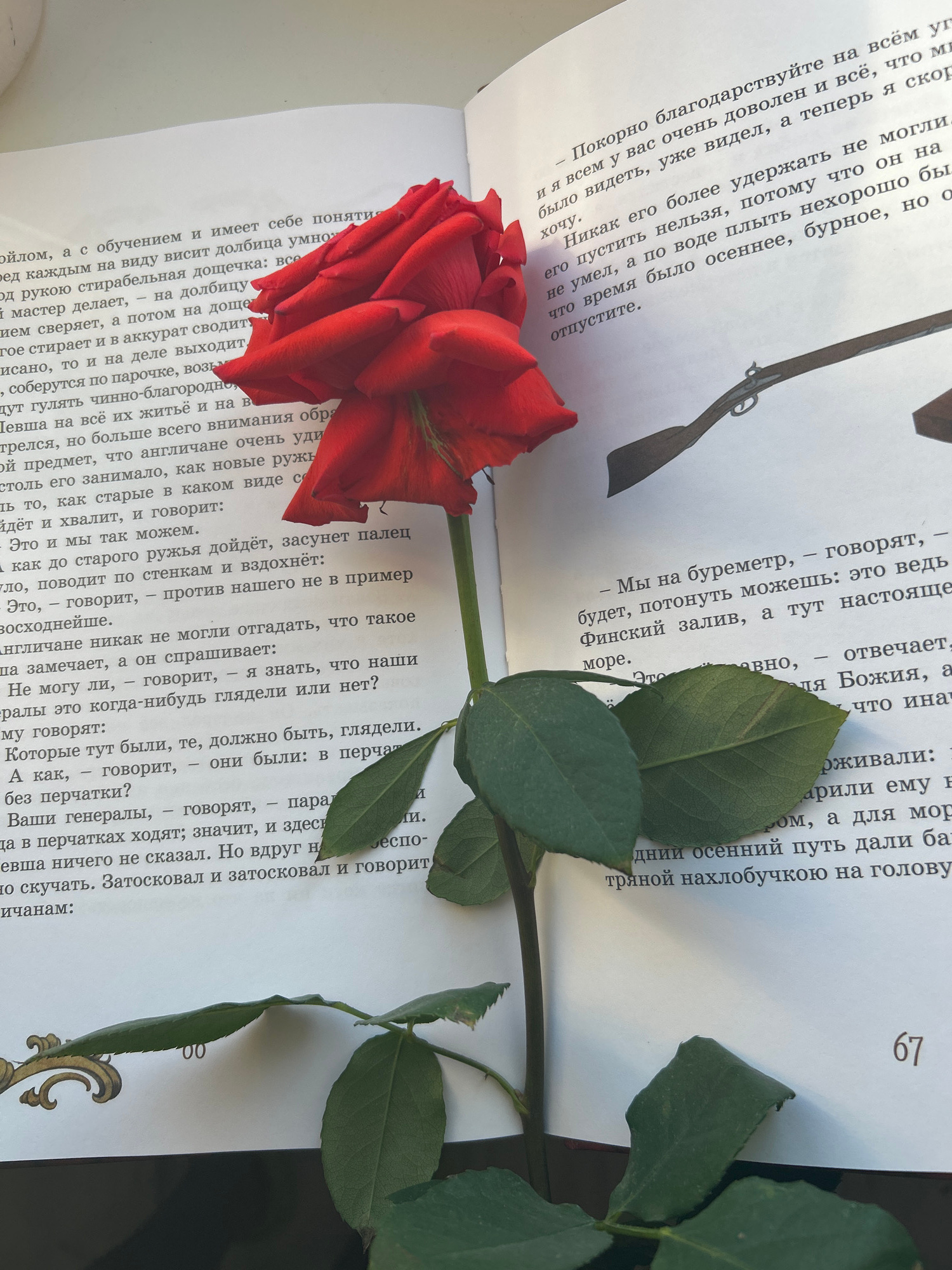 A vibrant red rose with green leaves is prominently displayed, resting diagonally across the open pages of a book. The image is captured from an elevated, angled perspective, highlighting the interpla…read more