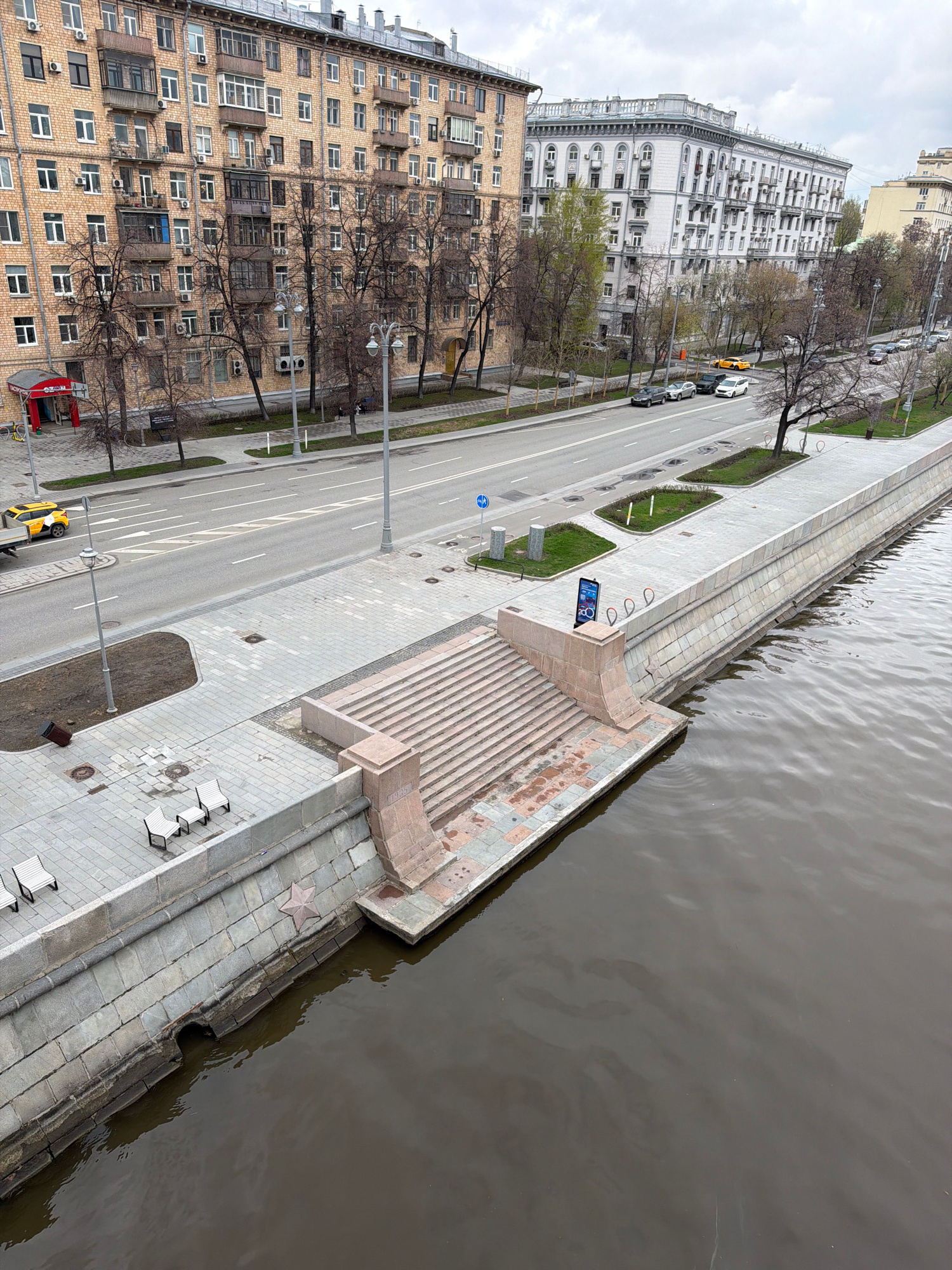 This high-angle, overhead shot captures a section of a riverside embankment, a multi-lane road, and urban buildings under an overcast sky. The scene is presented from a tilted perspective, looking dow…read more