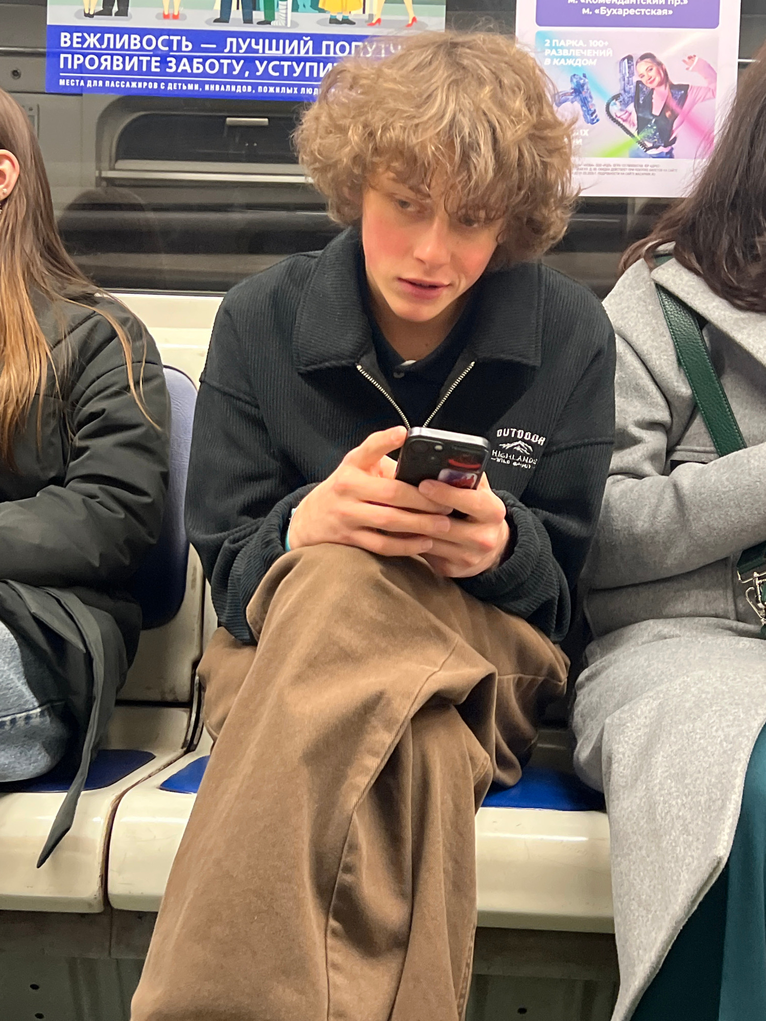 The photograph shows people riding on public transportation, presumably a train or subway in Shushary, Russia. The people are seated, with one person looking at their phone. There is an advertisement…read more