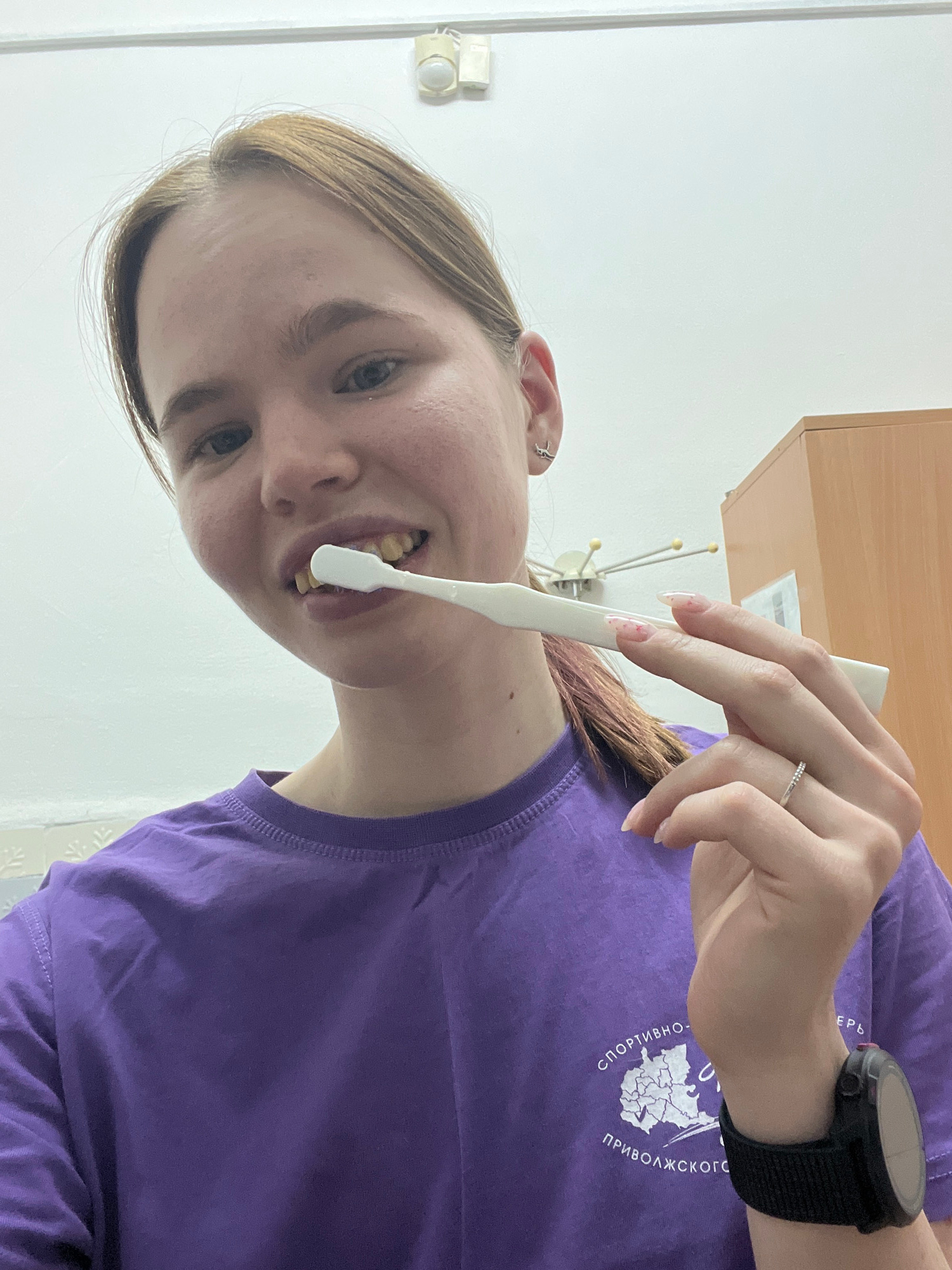 A woman is brushing her teeth with a white toothbrush. She is wearing a purple t-shirt with a graphic and text in Russian. She also has a black smartwatch on her left wrist. The background appears to…read more