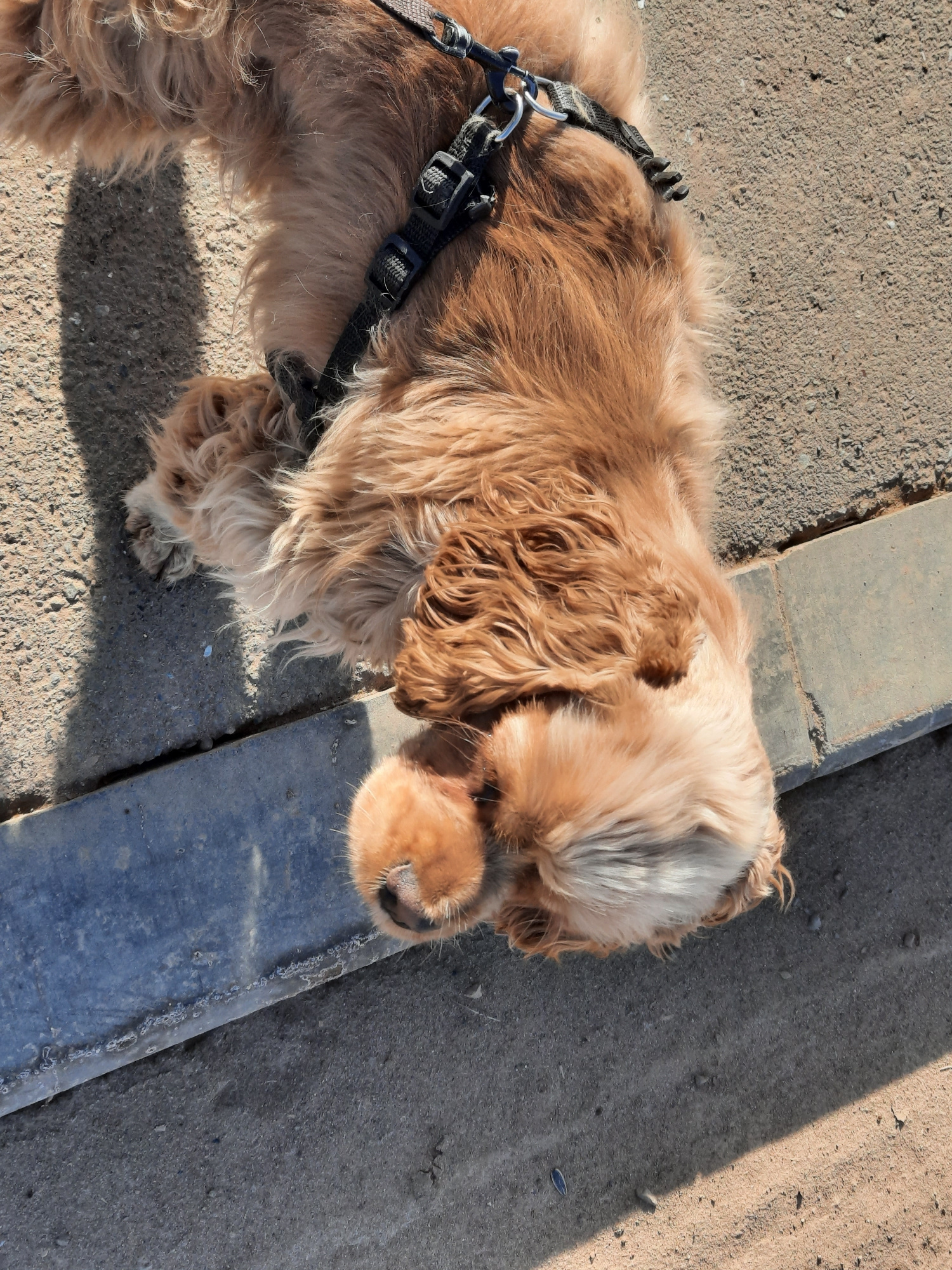 A medium-sized, golden-colored Cocker Spaniel wearing a black harness lies upside down on a paved surface near a curb. The dog's paws are lifted and its fur is ruffled. The location appears to be outd…read more