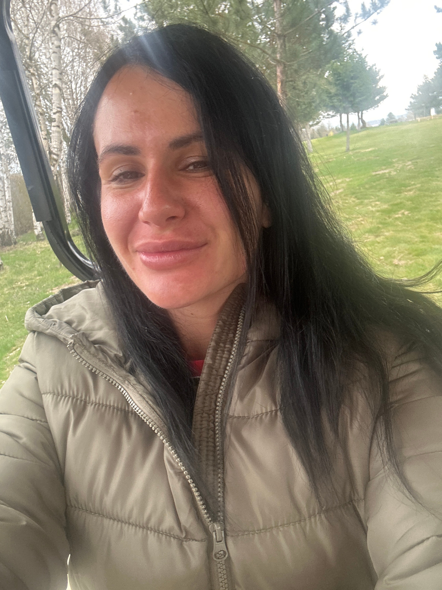 A woman with dark hair and fair skin poses for a selfie. She is wearing a khaki puffer jacket. In the background is a grassy field with trees. The location appears to be Razlog, Bulgaria.