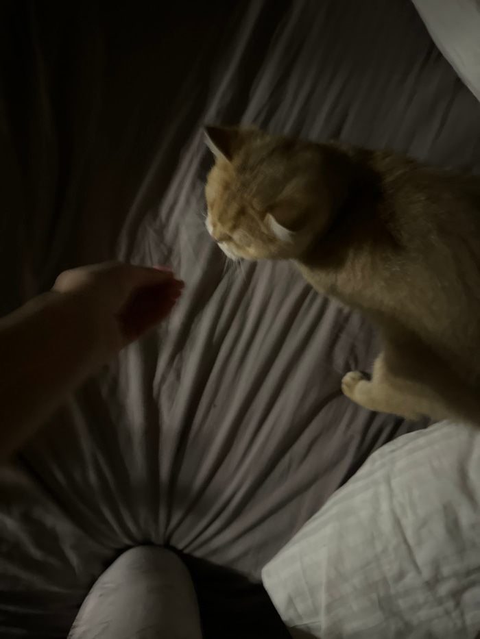 An orange tabby cat stands on a wrinkled gray bedsheet, its head oriented towards a person's hand. The hand is extended upward. A white pillow sits in the top right corner, and another is in the botto…read more