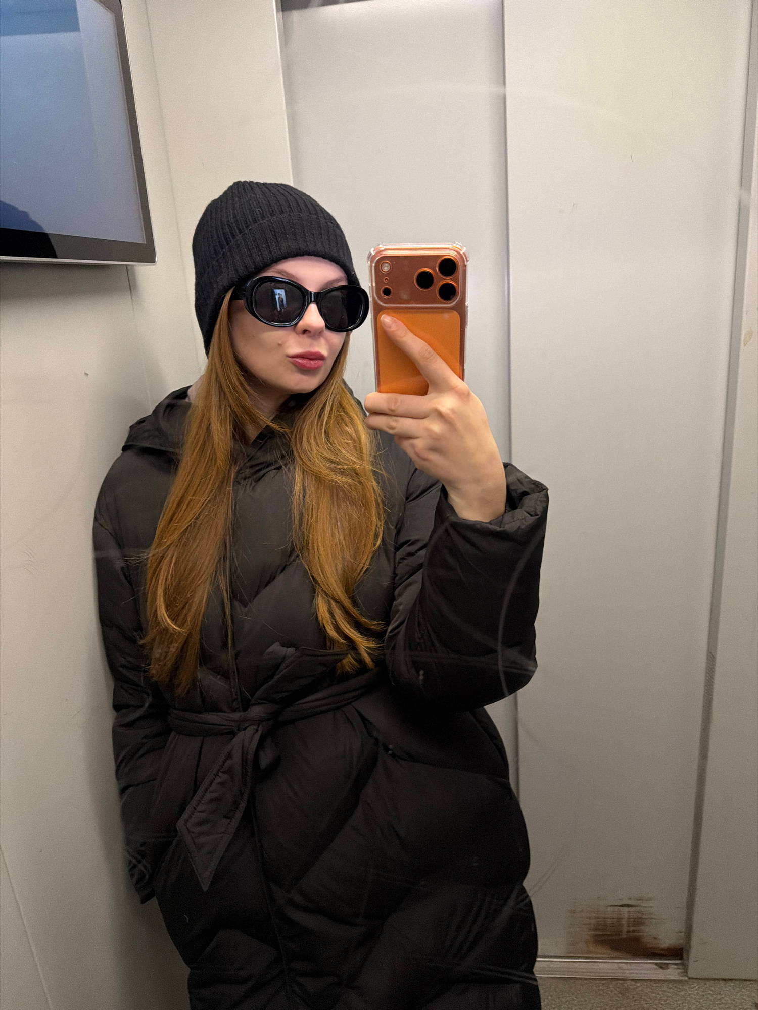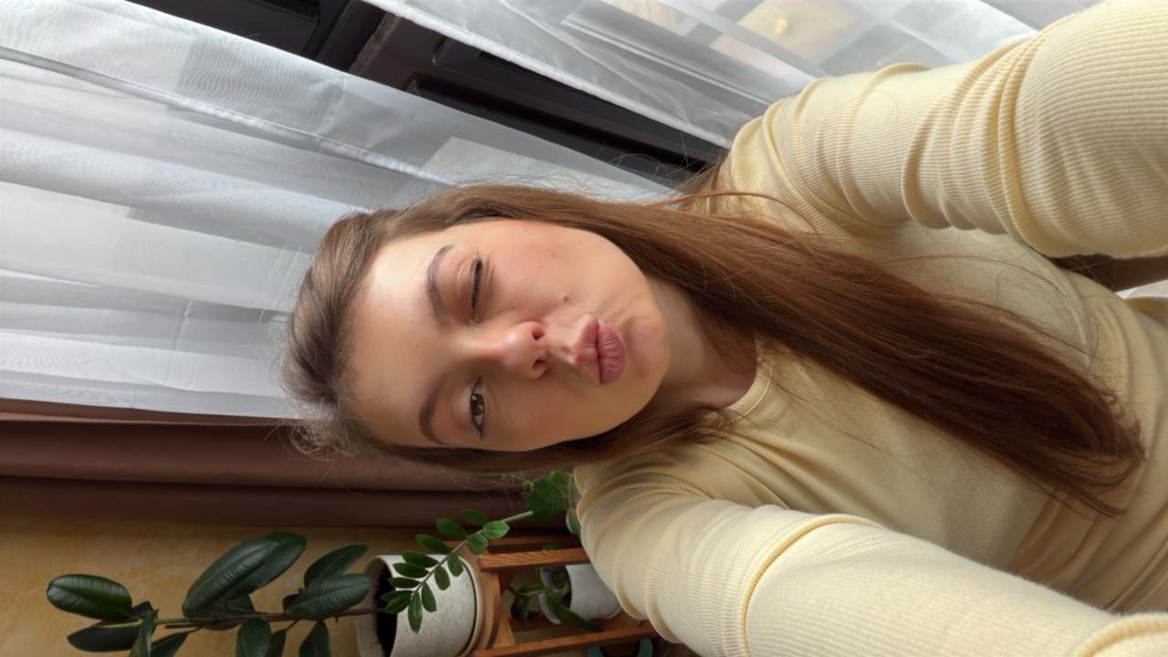 This indoor image from Khimki, Russia, shows a young woman taking a selfie in a reflective surface, likely a mirror. She is positioned slightly off-center and appears to be standing or sitting upright…read more