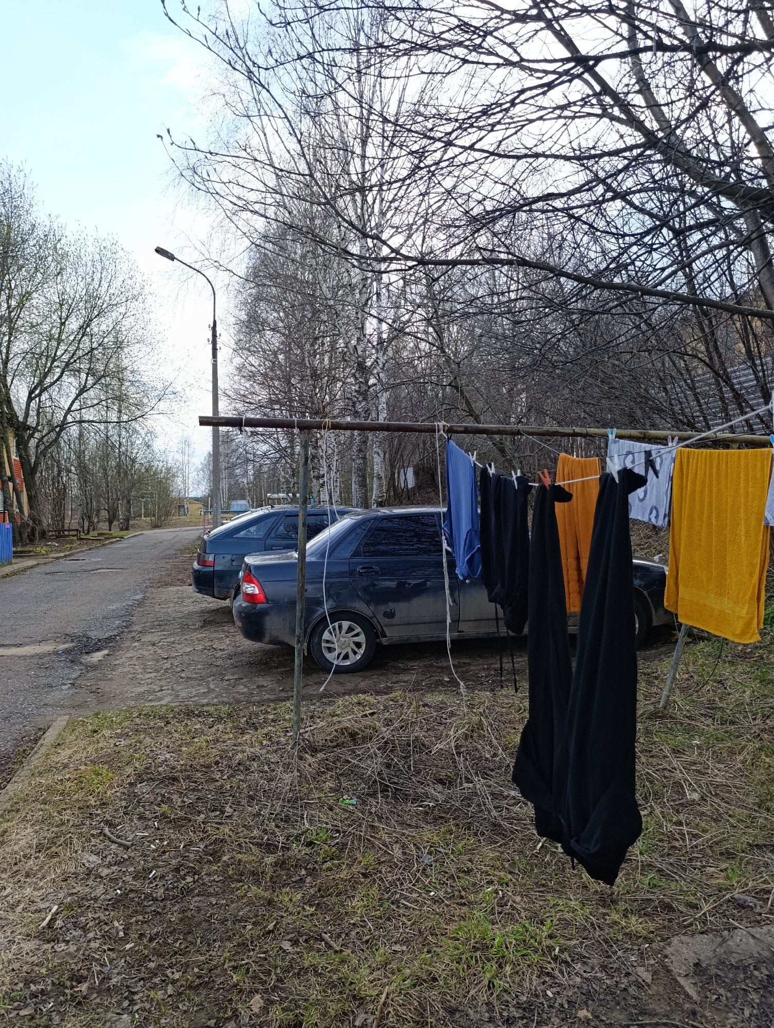 The scene depicts a residential area in Большой Букор, Russia, with a dirt patch alongside a cracked asphalt road. Two dark-colored Lada sedans are parked partially on the dirt, their exteriors appear…read more