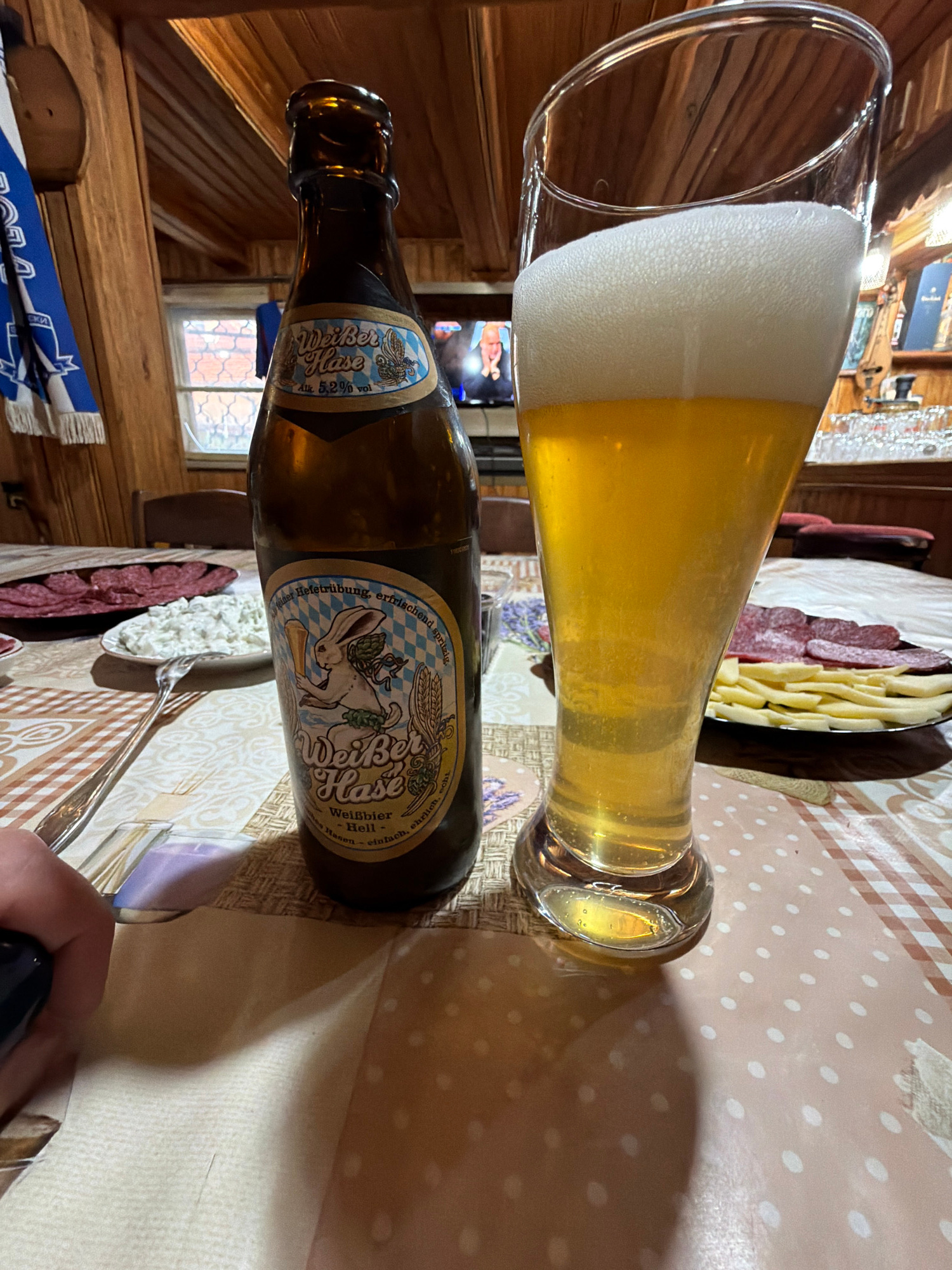 The image shows a glass filled with beer next to a beer bottle labeled "Weißer Hase." The bottle is lying on its side on a tablecloth with a brown and white checkered pattern. There is a plate with sa…read more