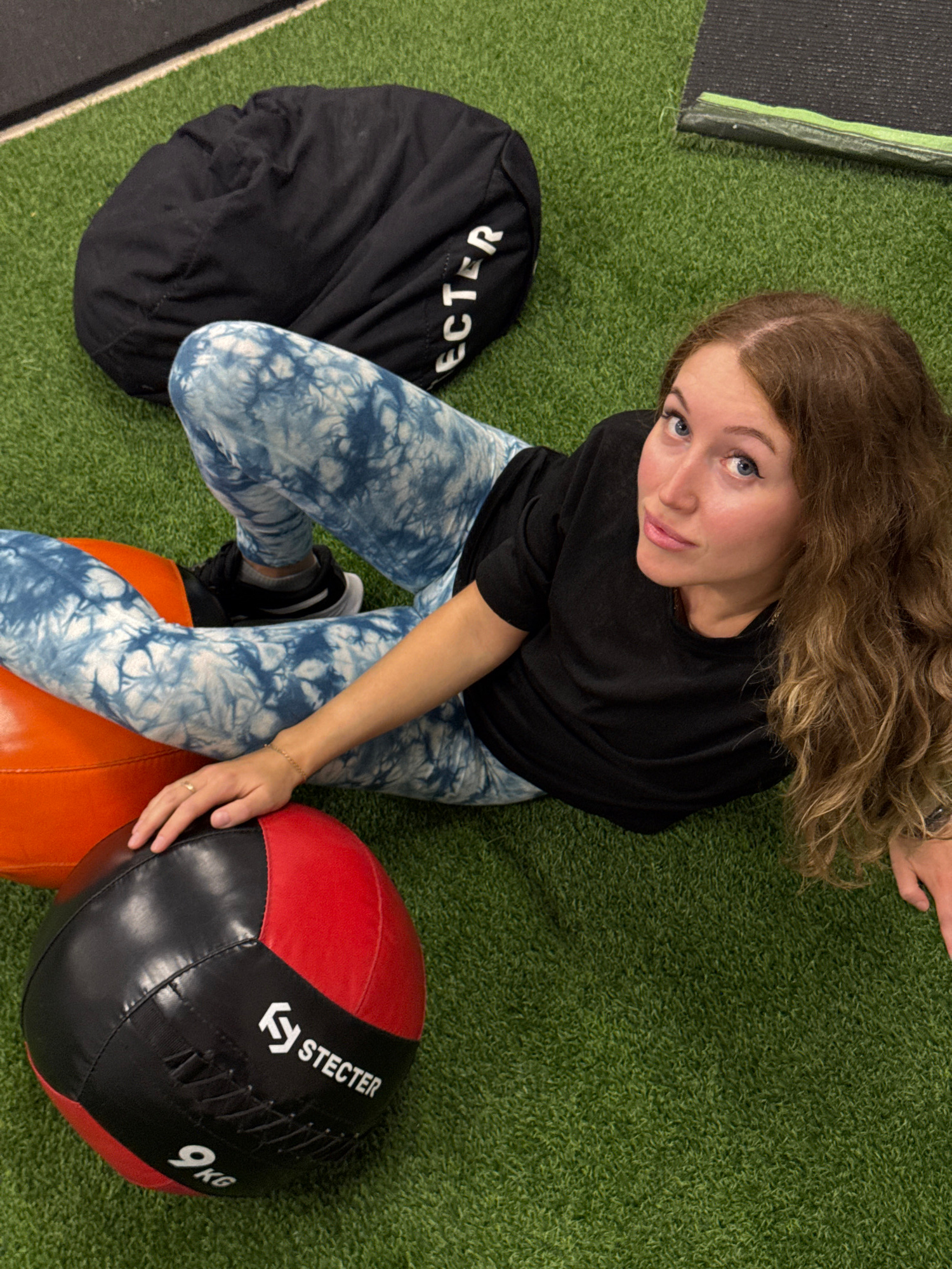 A young woman is depicted sitting on a green artificial turf floor, likely within a gym or fitness facility in Chaikovsky, Russia. She has long, wavy brown hair and blue eyes, looking upwards directly…read more