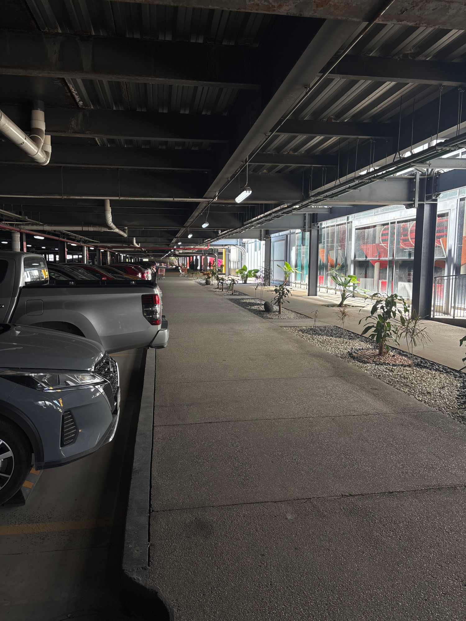 The image depicts an indoor parking structure in San Pedro Cholula, Mexico. The structure has a wall on the left side made of dark, corrugated metal panels supported by a steel framework. Utility pipe…read more