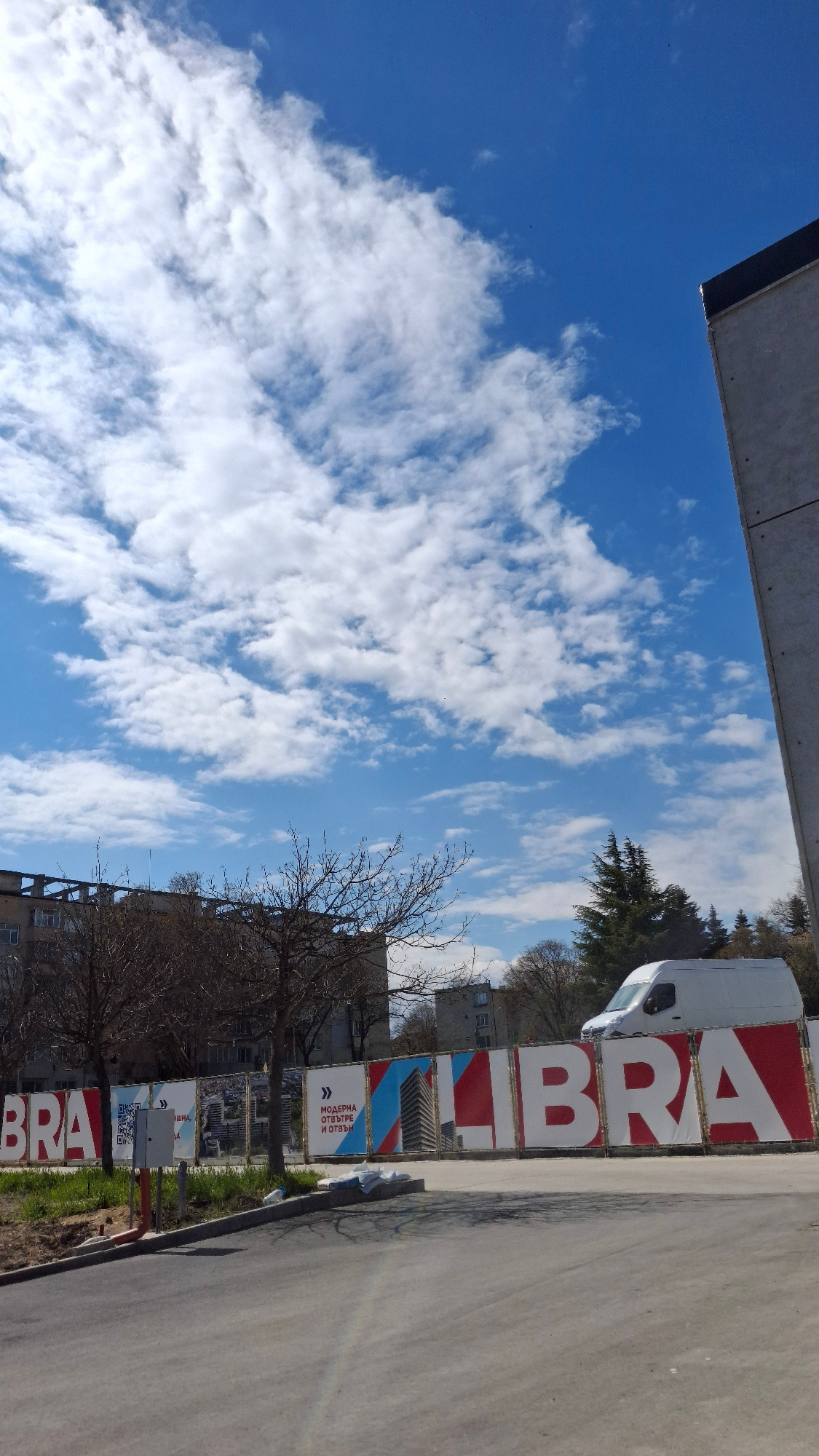 The image shows a clear blue sky with scattered white clouds. Below the sky, there's a view of the Libra office building and associated marketing signage in Varna, Bulgaria. A tree with bare branches…read more