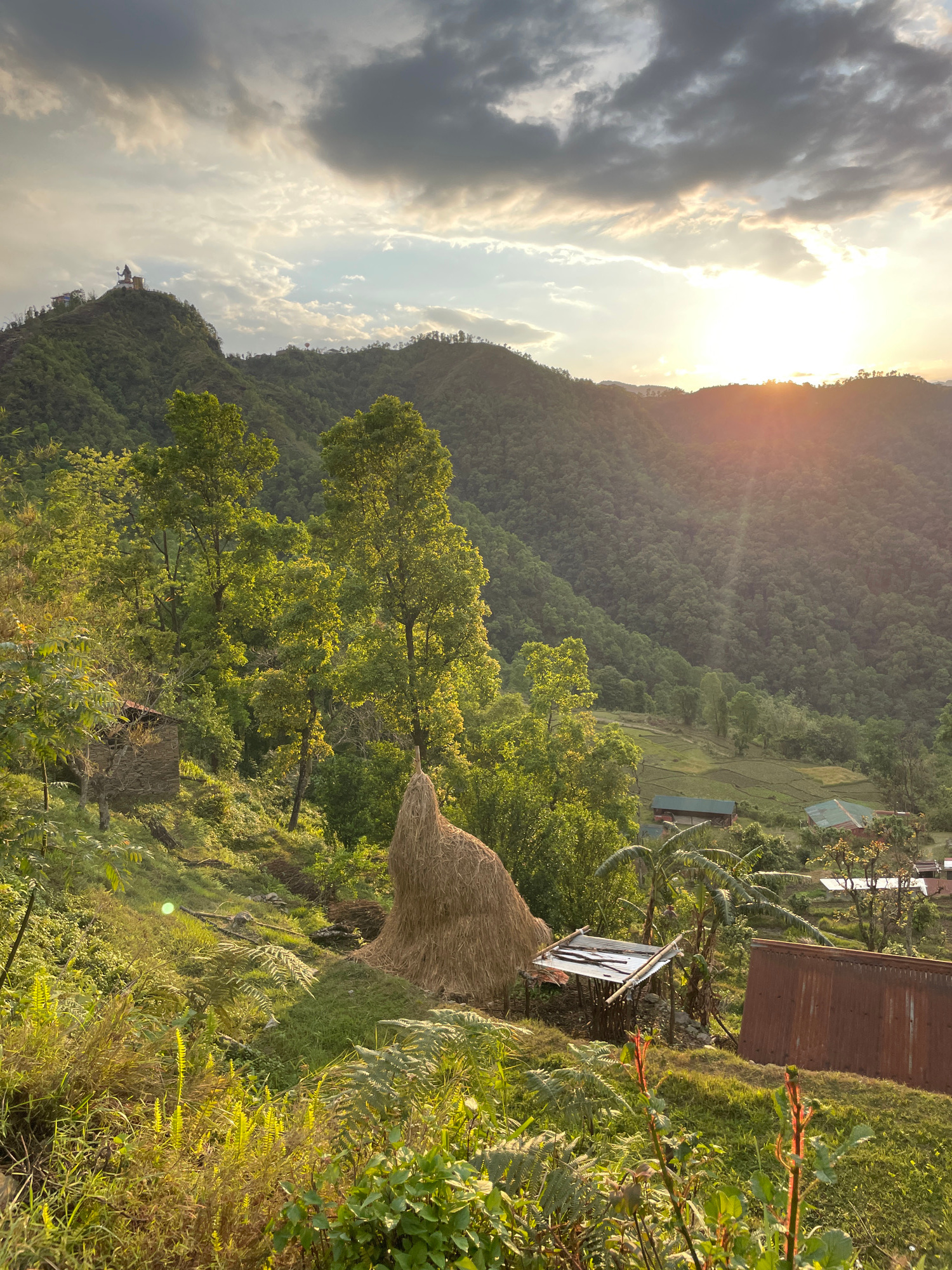 The image captures a mountainous landscape in Pokhara, Nepal, at what appears to be dusk or dawn. Sunlight is visible through a break in the clouds near the crest of a mountain, casting a warm glow. T…read more
