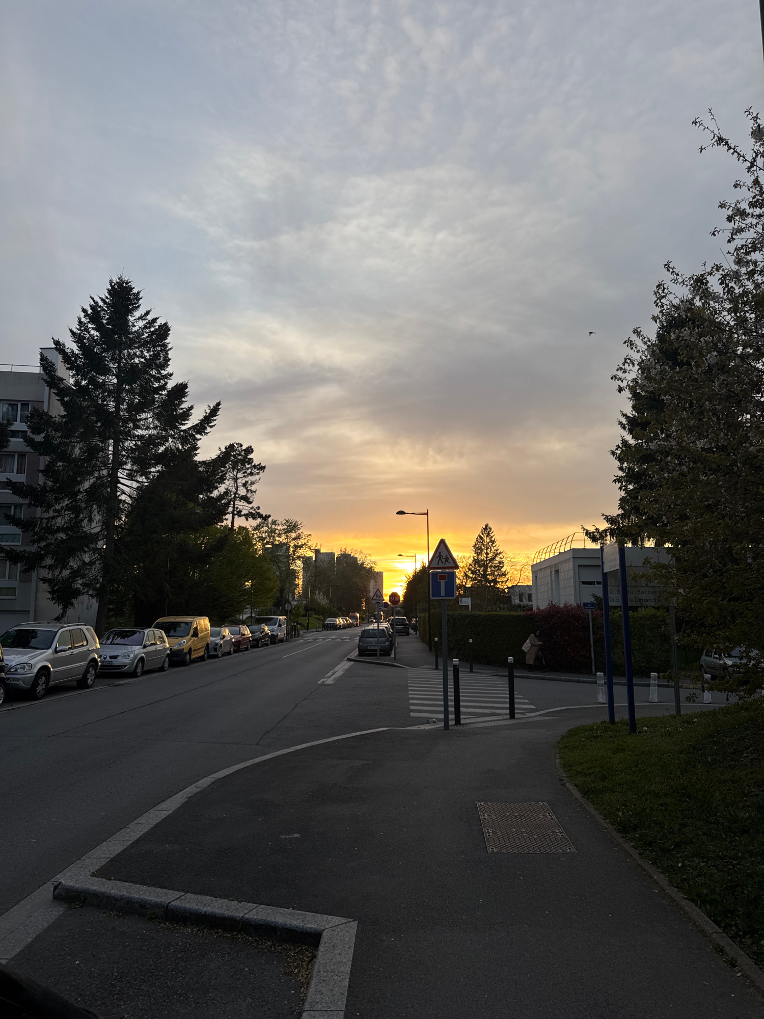 A street in Les Ulis, France, is lined with parked cars. The sky is a mix of grey clouds and a bright orange sunset. A pedestrian crossing sign is visible. Trees line both sides of the street. The ima…read more